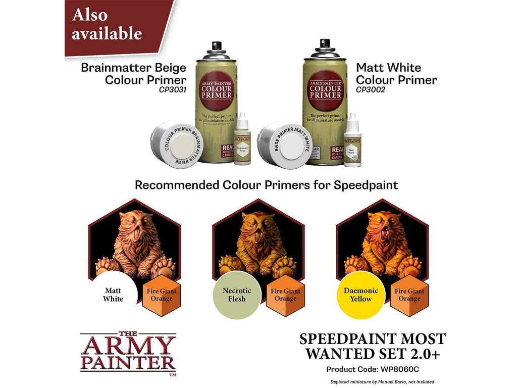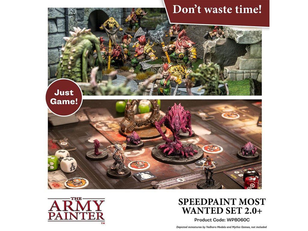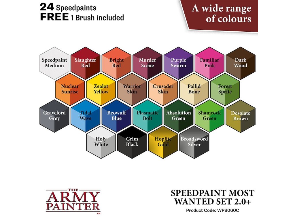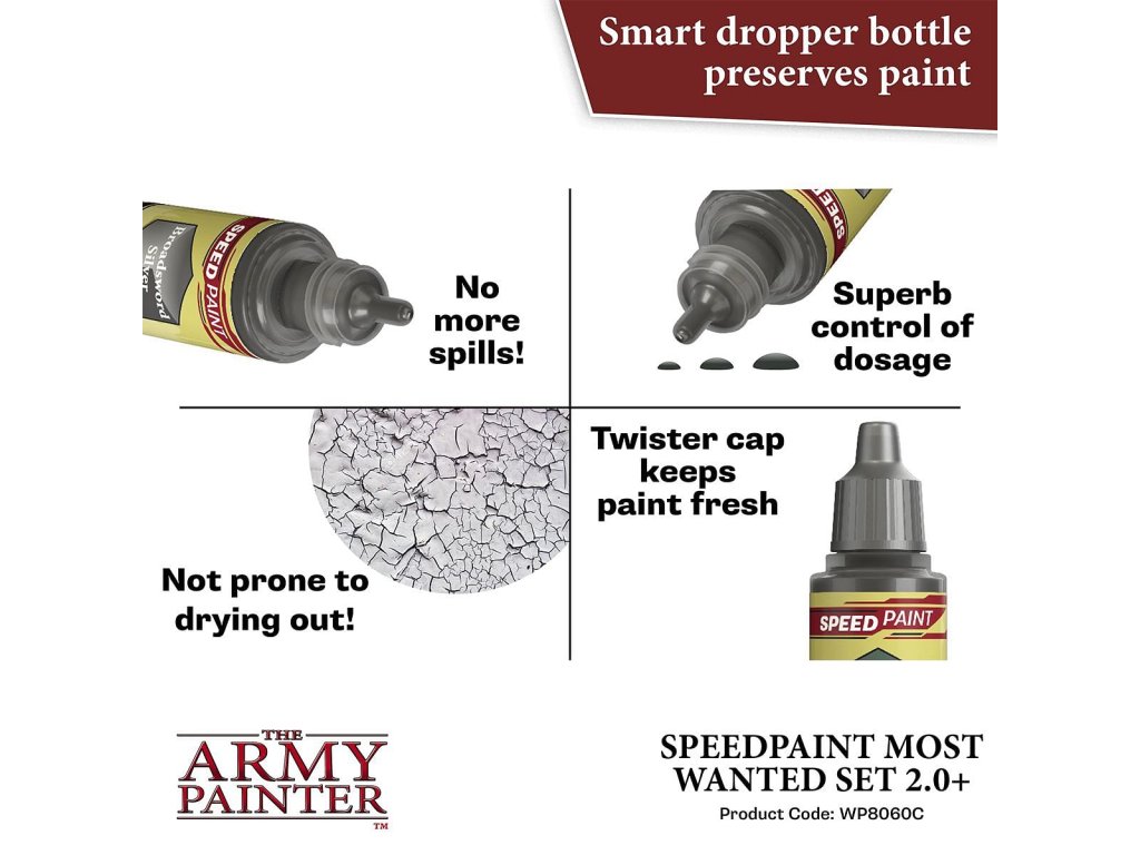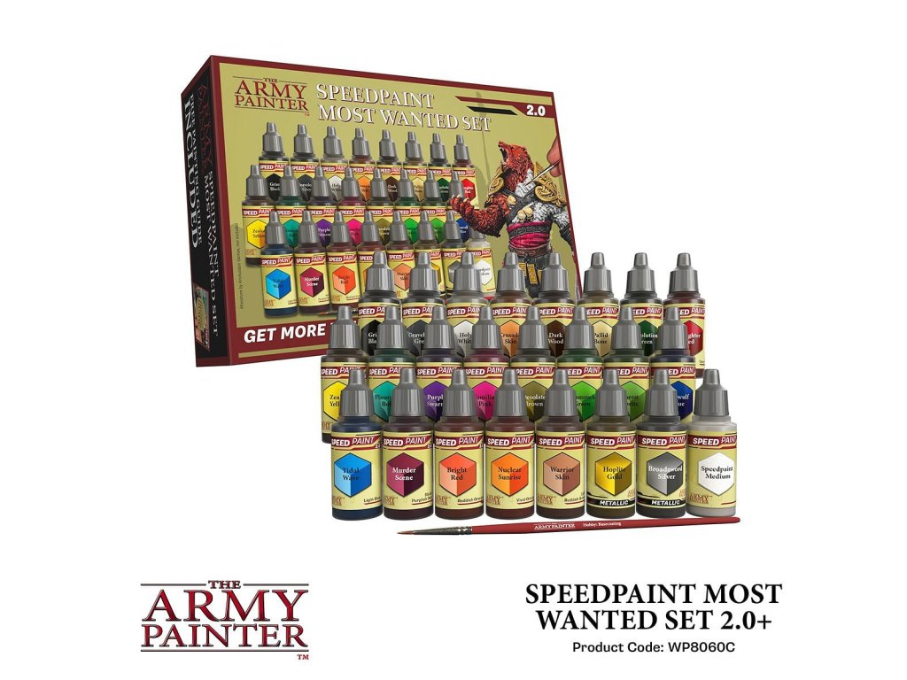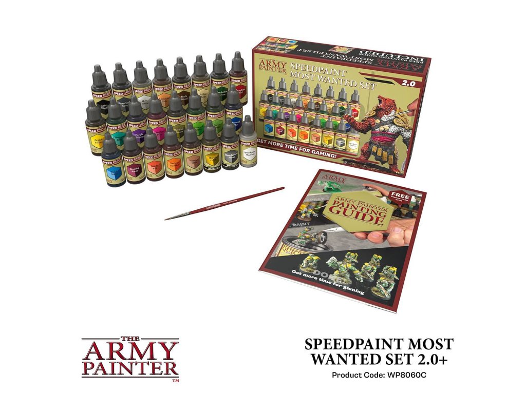 Sada Army Painter: Speedpaint Most Wanted Set 2.0 obsahuje 24 barev Speedpaint, s nimiž můžete ihned začít barvit miniatury a ušetříte čas na hraní! Stačí jen nanést bohatou vrstvu barvy Speedpaint na miniaturu opatřenou základním nátěrem a máte hotovo. Objem každé lahvičky je 18ml a obsahuje dvě míchací kuličky. Obsah balení: 21x Speedpaints 2x Speedpaint Metallics 1x Speedpaint Medium 1x Basecoating Brush