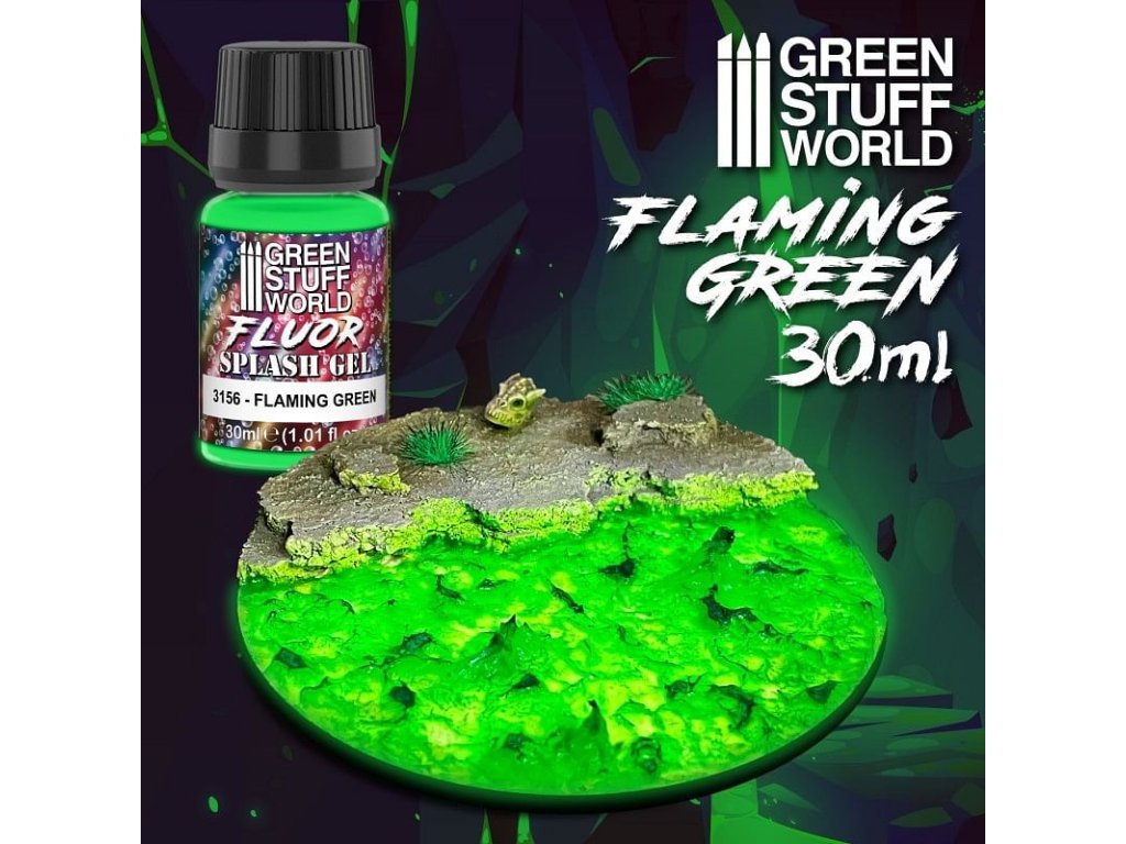 Dodejte svým podstavcům, dioramatům, bojišti či scenérii realistický nádech pomocí ohně nebo plamenů! Green Stuff World: Splash Gel - Flaming Green je fluorový poloprůhledný akrylový gel pro tvorbu efektu pohyblivých plamenů, magmatu, požáru či magických efektů. Nechte gel zaschnout, dokud nebude čirý (cca 24 hodin - doba schnutí se může lišit podle síly vrstvy). Pro zlepšení tekutosti lze gel ředit vodou nebo akrylovým ředidlem. Gel není toxický, objem balení je 30 ml.Doplňkové parametry