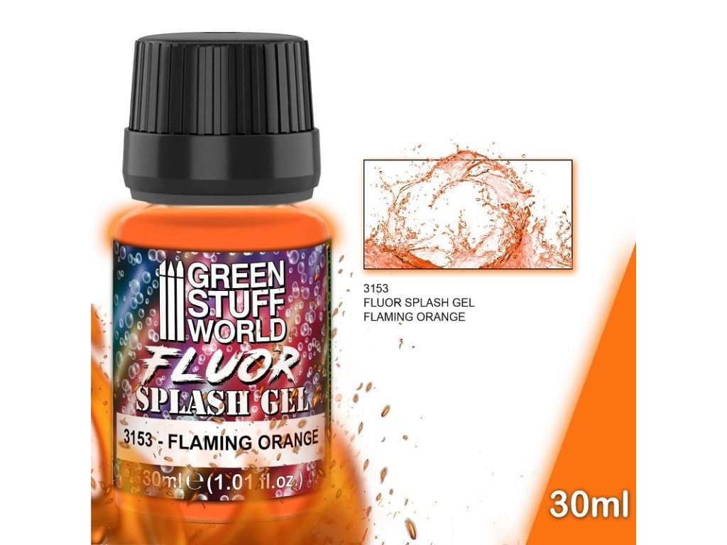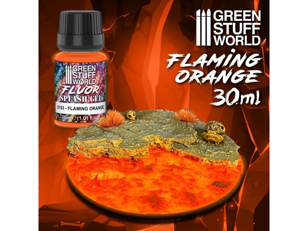 Dodejte svým podstavcům, dioramatům, bojišti či scenérii realistický nádech pomocí ohně nebo plamenů! Green Stuff World: Splash Gel - Flaming Orange je fluorový poloprůhledný akrylový gel pro tvorbu efektu pohyblivých plamenů, magmatu, požáru či magických efektů. Nechte gel zaschnout, dokud nebude čirý (cca 24 hodin - doba schnutí se může lišit podle síly vrstvy). Pro zlepšení tekutosti lze gel ředit vodou nebo akrylovým ředidlem. Gel není toxický, objem balení je 30 ml.Doplňkové parametry