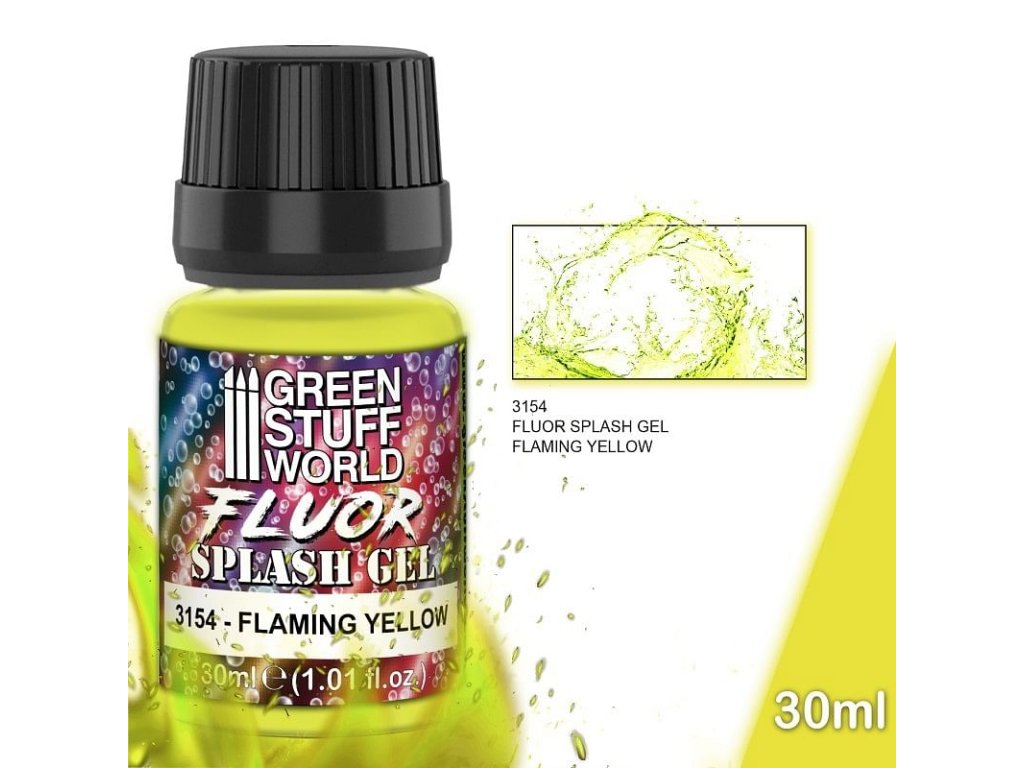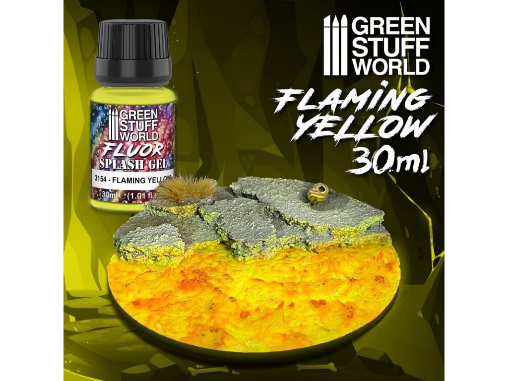 Dodejte svým podstavcům, dioramatům, bojišti či scenérii realistický nádech pomocí ohně nebo plamenů! Green Stuff World: Splash Gel - Flaming Yellow je fluorový poloprůhledný akrylový gel pro tvorbu efektu pohyblivých plamenů, magmatu, požáru či magických efektů. Nechte gel zaschnout, dokud nebude čirý (cca 24 hodin - doba schnutí se může lišit podle síly vrstvy). Pro zlepšení tekutosti lze gel ředit vodou nebo akrylovým ředidlem. Gel není toxický, objem balení je 30 ml.Doplňkové parametry