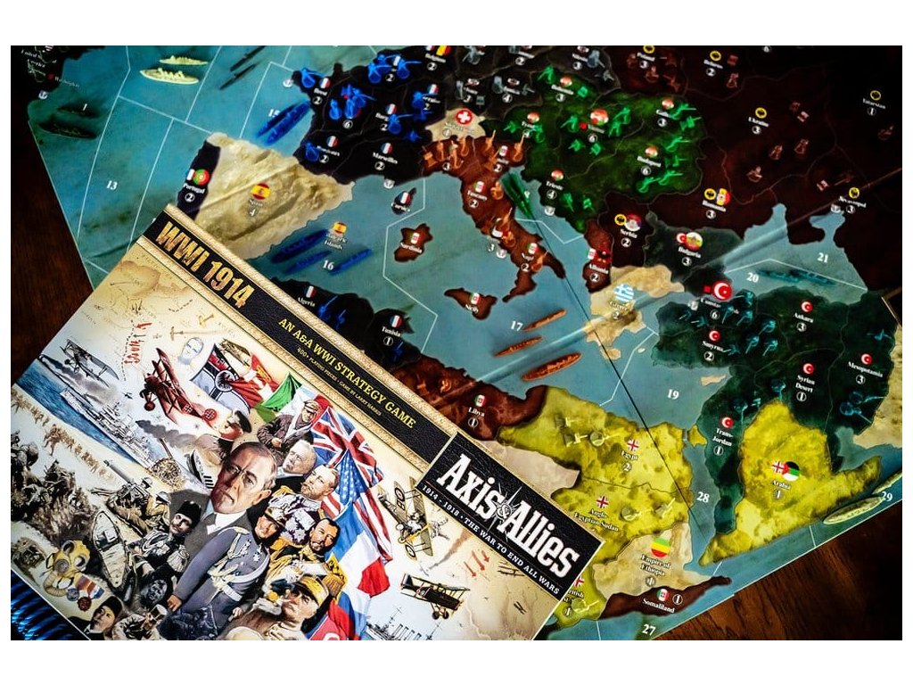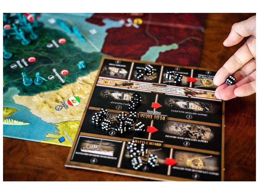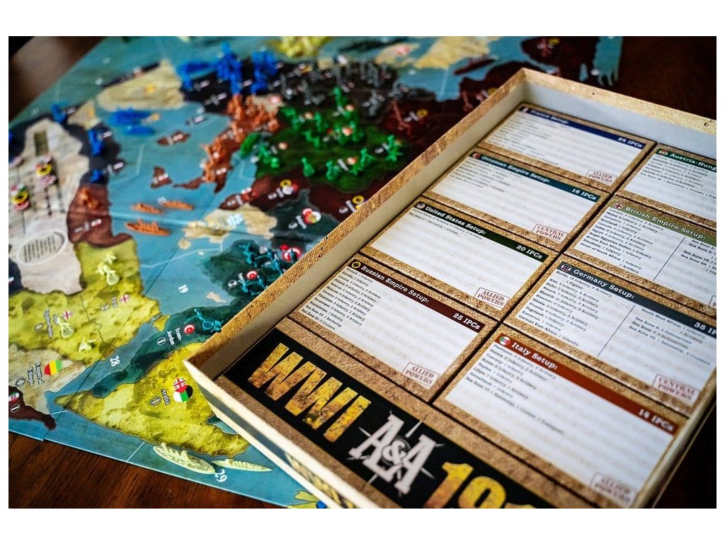 Se zavražděním arcivévody Františka Ferdinanda Rakouska srbským nacionalistou v Sarajevu je zapálena pojistka a armády Evropy, a brzy celého světa, se vydají na pochod. Tato válka bude jako žádná jiná, kterou kdy lidstvo svádělo. S příchodem kulometů, létajících strojů, tanků a chemických zbraní budou ztráty počítány na miliony a postupy proti nepříteli počítány v yardech. Ochoz vede osm hlavních mocností. Centrální mocnosti Německa, Rakousko-Uherské říše a Osmanské říše jsou postaveny proti velké alianci Francie, Britského impéria, Ruského impéria, Itálie a nakonec Spojených států. Co je nového: - Aktualizovaná omezená edice Renegade - Obsahuje více německých a britských pěchotních jednotek, 30 dalších žetonů a aktualizace pravidel z oficiálních oprav! Vlastnosti: - Epická hra Axis & Allies zasazená do první světové války. - Přes 400 plastových miniatur! - Extra velká hrací plocha 34" x 32" pro větší herní zážitek. Shrnutí obsahu: - 2 herní desky - 8 národních úložných boxů - 1 generální úložný box - 1 bojová deska - 1 pravidla - 36 kostek - 120 národních kontrolních značek (15 pro každou mocnost) - 190 žetonů (70 světle červených, 25 tmavě červených, 70 světle modrých, 25 tmavě modrých) - Více než 400 plastových miniatur. Na první pohled - Počet hráčů: 2-8 - Pro věk: 12+ - Doba hraní: 4-6 hodin - Typ hry: Strategie.