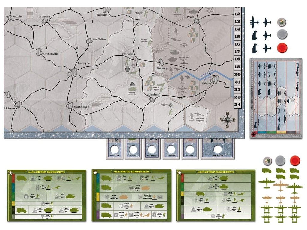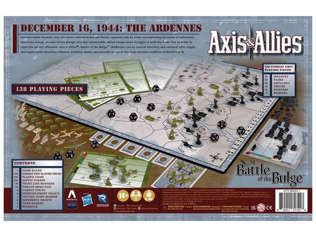 Německé tanky hučí do zasněženého lesa Ardennes, proti nimž stojí jen několik nic netušících divizí vyčerpaných amerických vojáků. Když osy sil prorazí do venkovské krajiny, spojenecké jednotky musí zápolit s udržením frontové linie, aby odrazily úplný útok. Axis & Allies: Bitva o Bulge vyzývá dva hráče, aby ovládali území a zvládli nedostatky zásob, zatímco řídí pěchotu, dělostřelectvo, tanky a letadla v jednom z rozhodujících konfliktů druhé světové války.Vlastnosti- Znovu v tisku po 18 letech!- Ovládejte území a zvládněte nedostatek zásob, zatímco řídíte pěchotu, dělostřelectvo, tanky a letadla v jednom z rozhodujících konfliktů druhé světové války.- Hrajte jako Spojené státy a Spojené království nebo Německo v této bitvě vedené hlava nehlava pro 2 hráče!- Obsahuje hru s hexagonální hrací deskou!- Více než 130 plastových figurinek je v balení!Na první pohled- Pro věk: 14+- Typ hry: Strategie- Hráči: 2- Délka hry: 3-4 hodiny.