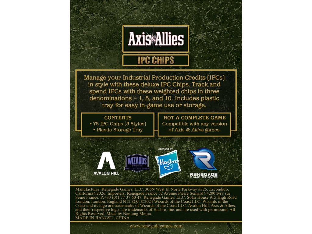 Spravujte své průmyslové výrobní kredity (IPCs) stylově s těmito luxusními IPC Chips. Sledujte a utrácejte IPCs s těmito zatíženými žetony ve třech nominálních hodnotách - 1, 5 a 10. Obsahuje plastovou misku pro snadné používání během hry nebo skladování. Není to kompletní hra. Kompatibilní s jakoukoli verzí Axis & Allies. Funkce- Sledování a utrácení IPCs- Obsahuje plastovou misku pro snadné používání během hry nebo ukládání- 75 zatížených žetonů IPC ve třech nominálních hodnotách - 1, 5 a 10. Obsah- 75 IPC Chips (3 styly)- Plastová skladovací miska Na první pohled- Pro věk: 12+
