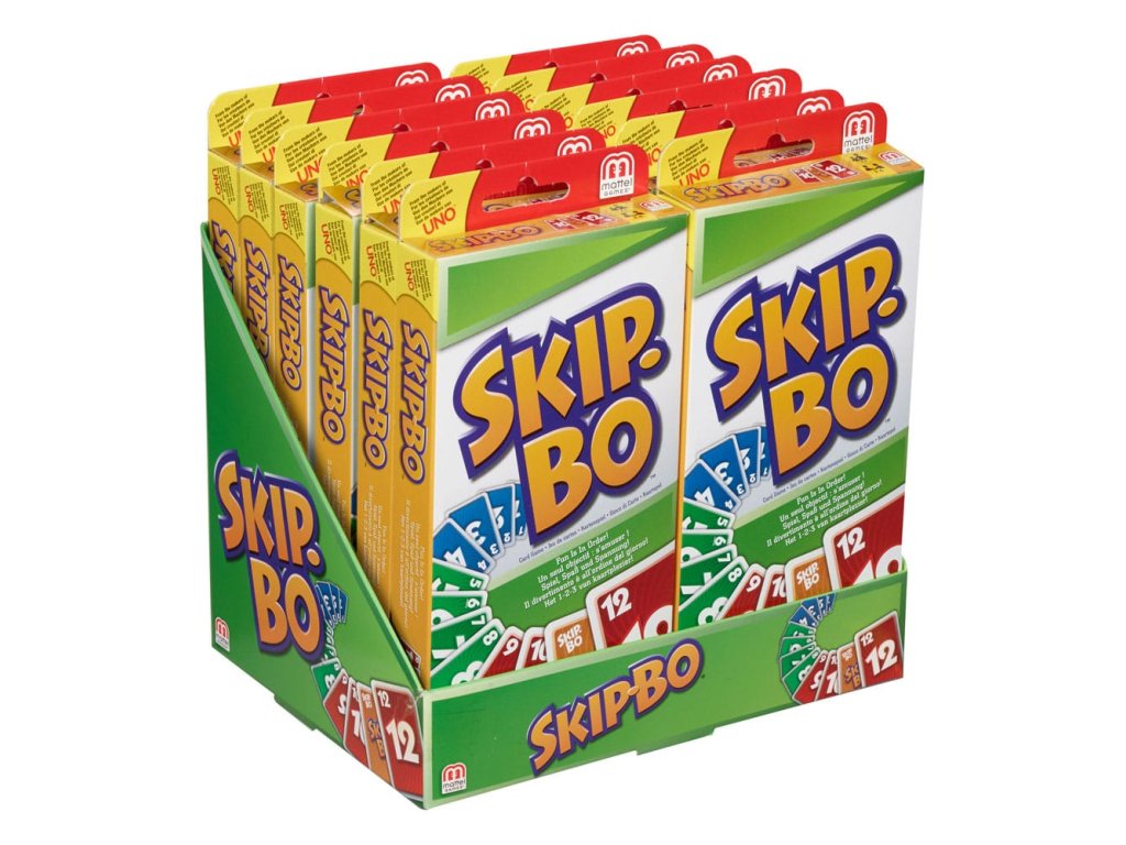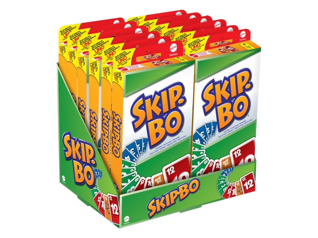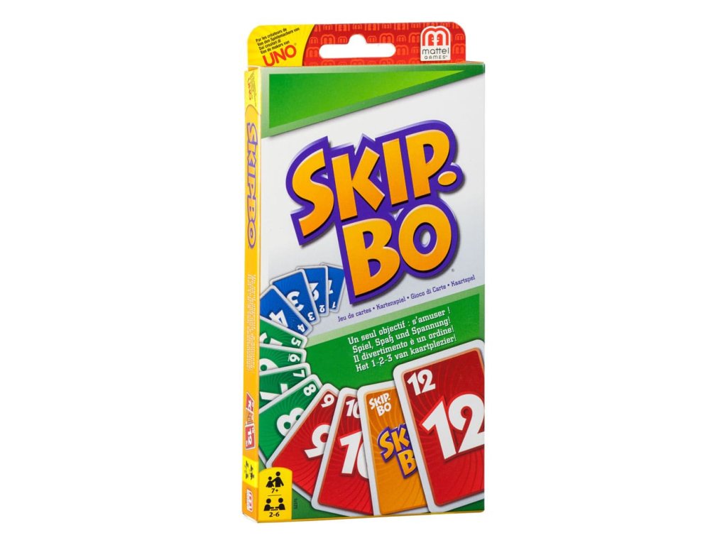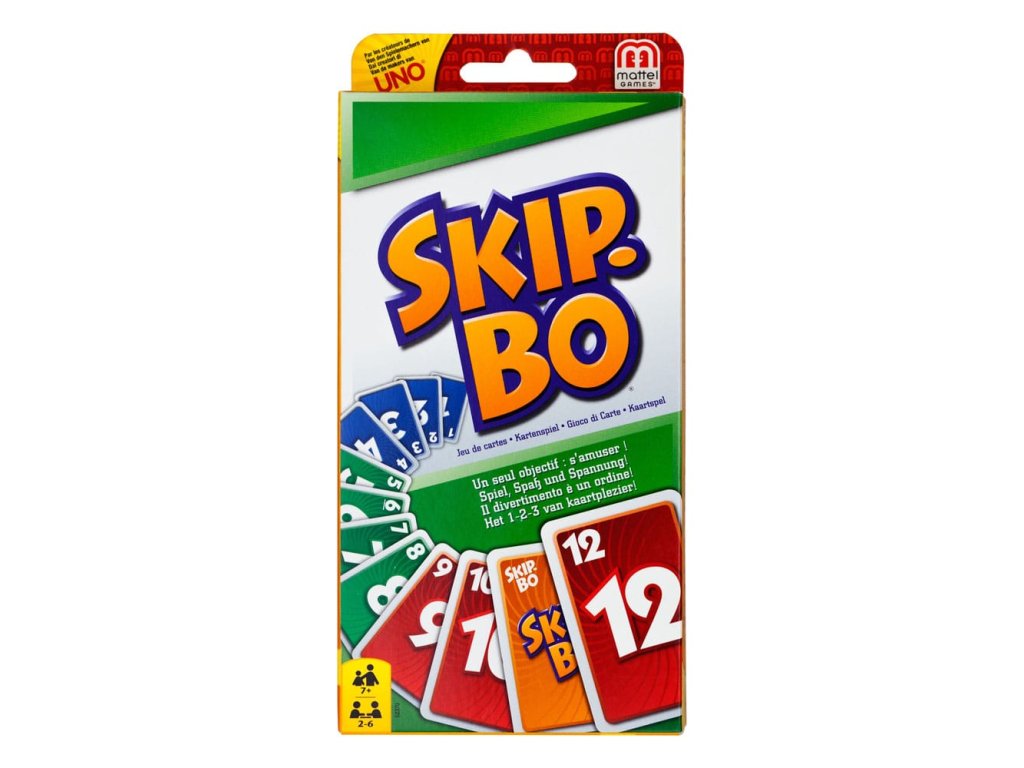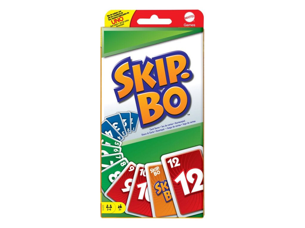 Skip-Bo® je vrcholná sekvenční karetní hra od tvůrců UNO®! Hráči používají dovednosti a strategii pro vytváření balíčků postupně číslovaných karet ve vzestupném pořadí (2,3,4...) do té doby, než nemají žádné další karty k hraní. Jakmile každý dostane svůj osobní zásobník karet, hra začíná tím, že se lízají karty z centrální hromádky a vytváří až čtyři „stavební“ hromádky. Karty Skip-Bo® „wild“ přerušují statické situace a mohou být hrány s jakýmkoli číslem. Používejte tyto karty moudře, protože vám mohou opravdu pomoci porazit vaše protivníky! První hráč, který vyčerpá všechny své karty ze zásobníku Skip-Bo®, je vítěz! Součástí je 162 karet a návod. Barvy a dekorace se mohou lišit. - Hráči: 2-6 - Věk: 7+ - Návod v mnoha jazycích