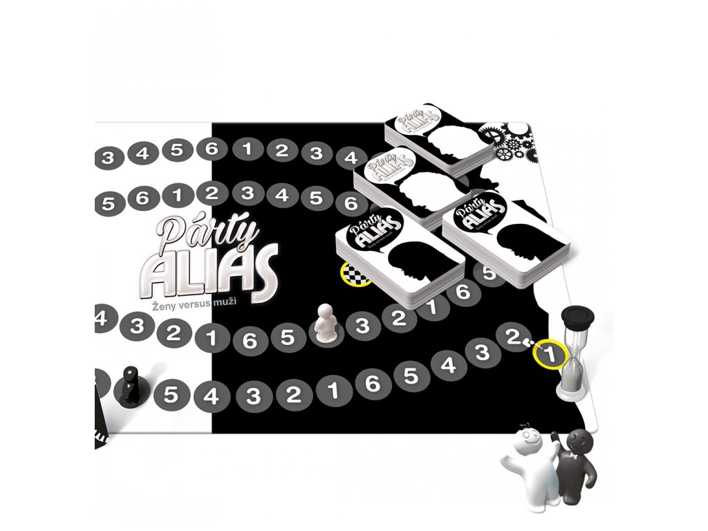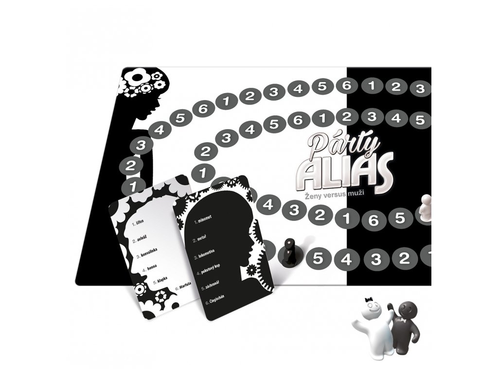 Hra Párty Alias Ženy versus muži obsahuje: herní plán, 400 karet obsahujících 2 400 slov, přesýpací hodiny, 2 figurky a pravidla.