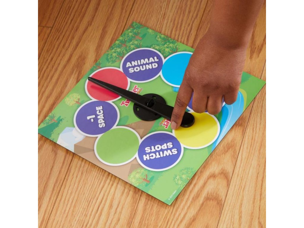 Tato zábavná hra pro děti od 3 let obsahuje oboustrannou podložku a otočné herní kolo pro 2 úrovně hry. Na straně podložky Zvířecí safari děti točí kolem, aby se pohybovaly po safari stezce. Jak se střídají, každé dítě má příležitost objevit barvy a znovu si zopakovat zvuky a pohyby zvířat. Otočte podložku a přesuňte se na úroveň 2 hry Zvířecí párty. Roztočte herní kolo, abyste viděli, na jakou barvu a zvíře musí hráči umístit svou nohu nebo ruku. Poslední hráč, který stojí, vyhrává!