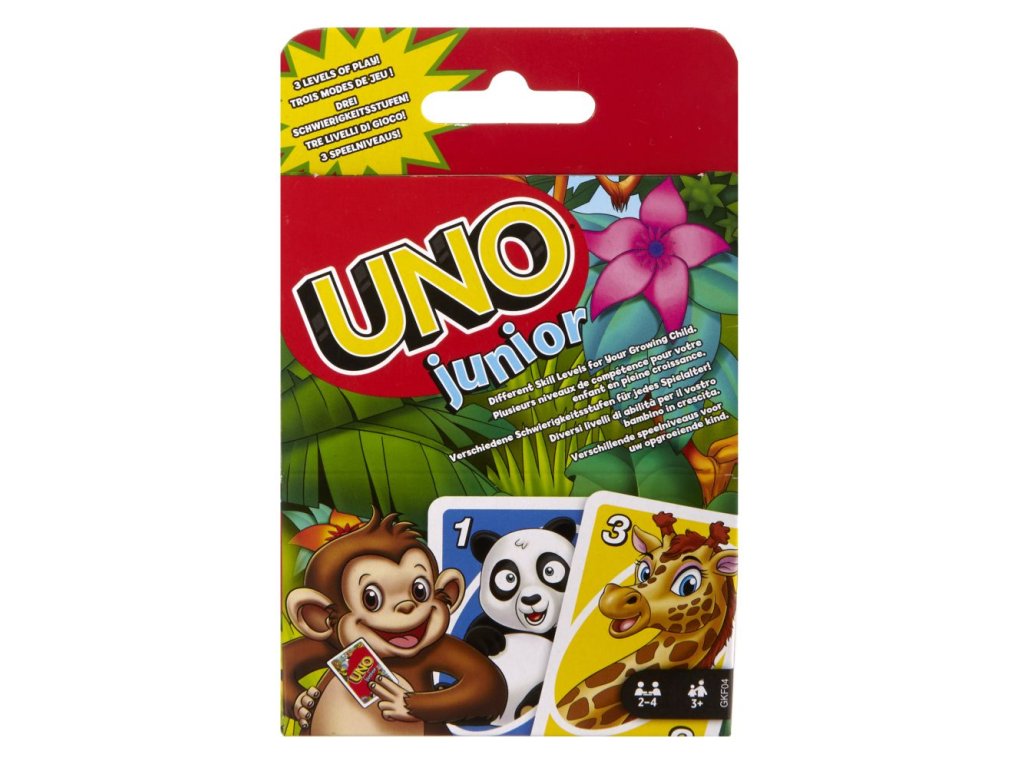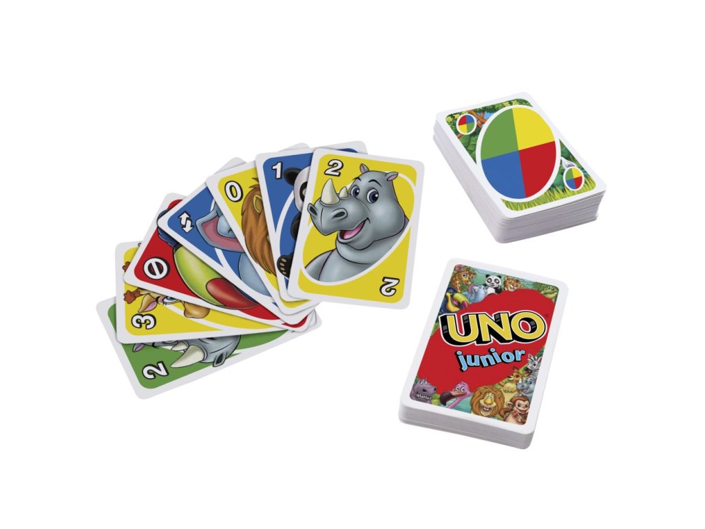 Tato zjednodušená karetní hra UNO® Junior zvířátka pro mladší hráče má několik úrovní hry, takže děti mohou s hrou růst. Na kartách jsou pro každé číslo od 0 do 8 vyobrazena roztomilá zvířátka ze zoo, takže přiřazování je snadné už pro děti od 3 let. Tři úrovně hry umožňují, aby hra držela krok s vývojem dítěte. Hráči závodí, kdo se zbaví všech svých karet tím, že je přiřadí ke kartě zobrazené na vrcholu balíčku, a to buď podle barvy, nebo podle zvířete/čísla. Až vám zůstane jedna karta, nezapomeňte zakřičet "UNO!". Barvy a provedení se mohou lišit.