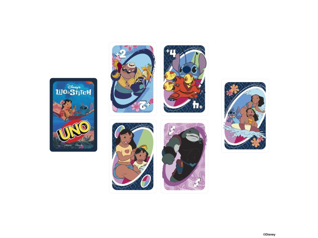 Fanoušci příběhů Lilo a Stitch si zamilují tuto tematickou UNO karetní hru. S balíčkem karet, inspirováným oblíbenými postavami a scénami z Lilo a Stitch, se hráči snaží spojit barvy a čísla jako v klasické hře UNO. Nechybí ani speciální karta s pravidlem "Ohana", které znamená, že každý hráč bude mít v ruce čtyři karty! A když vám zbude poslední karta, nezapomeňte zakřičet "UNO!"