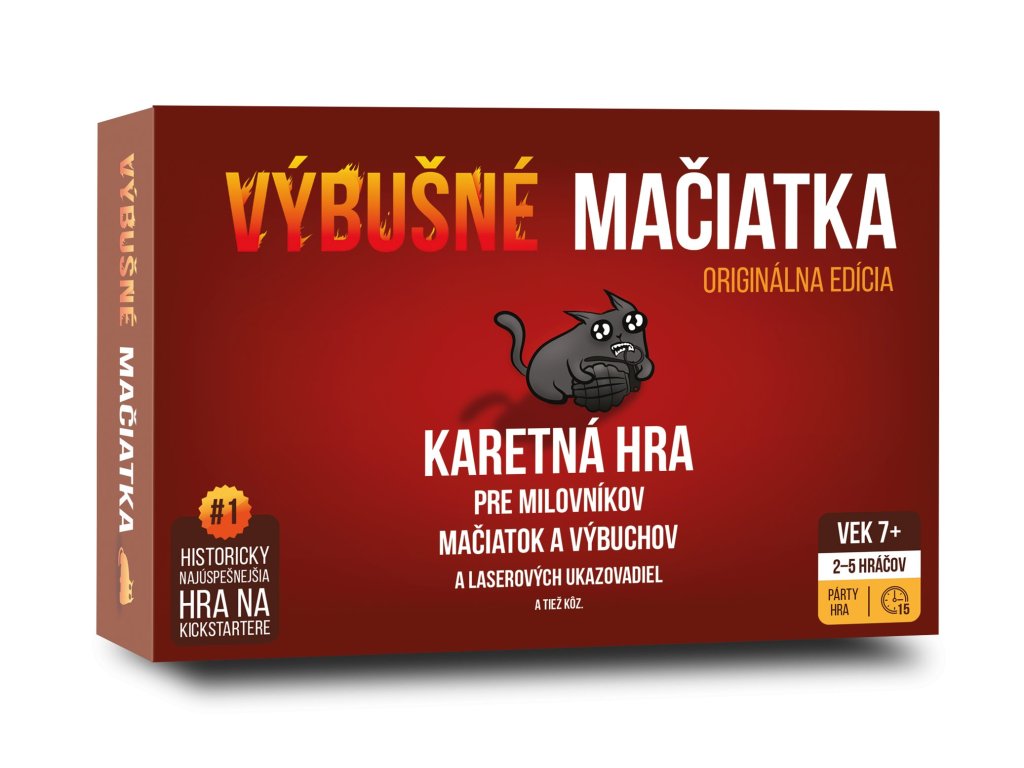 Výbušné mačiatka sú strategickou verziou ruskej rulety (akurát s mačiatkami). Hráči si doberajú karty, kým si niekto nedoberie výbušné mačiatko, exploduje, umrie a je vyradený z hry. Ale to len v prípade ak nemá kartu "zneškodni", ktorá mu umožní zneškodniť výbušné mačiatko, napríklad pomocou laserového ukazovadla, poškrabkaním na brušku alebo sendvičom s kocúrnikom. Úlohou všetkých ostatných kariet v balíčku je pomôcť hráčom chrániť sa pred výbušnými mačiatkami (alebo ich nastrčiť do cesty ostatným).Vtipné ilustrácie s ešte vtipnejšími textami vás pobavia a úplne vtiahnu do hry, ktorú budete chcieť hrať stále dokola. Každá karta je originál. Pravidlá hry sú veľmi jednoduché a vysvetlené za pár sekúnd.
