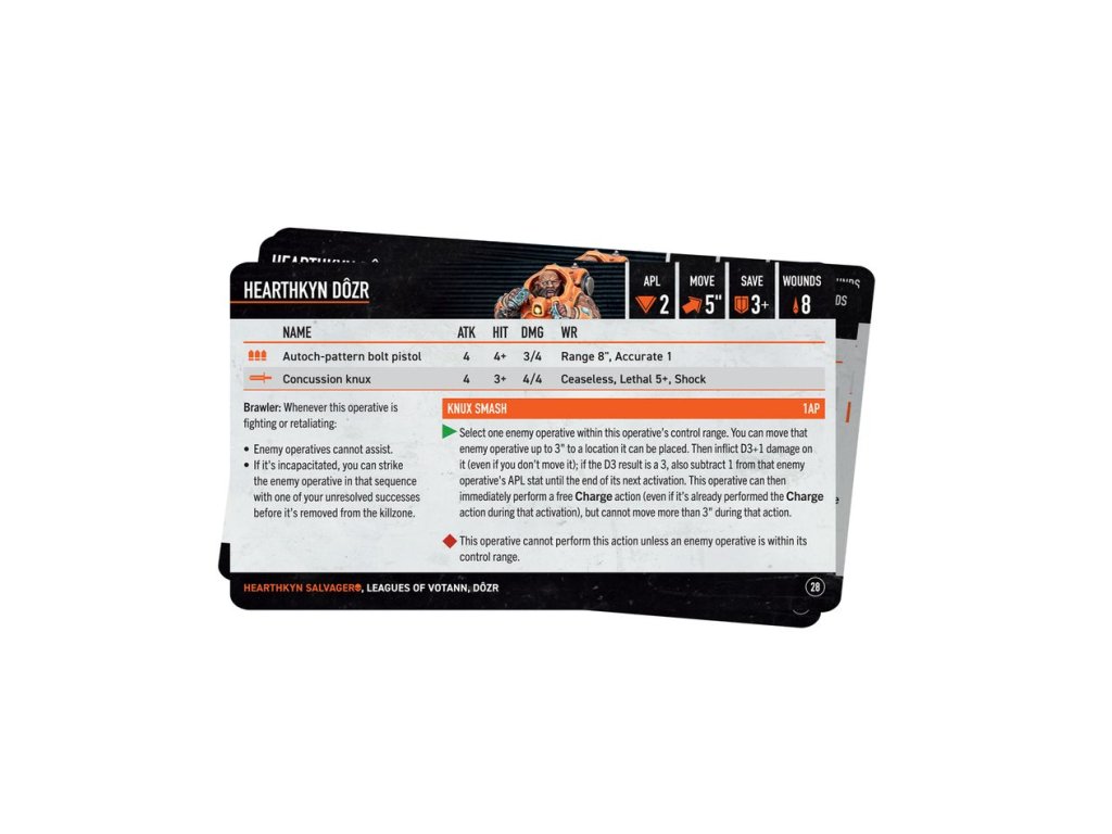 Tento balíček obsahuje pravidla, která budete potřebovat k nasazení Hearthkyn Salvagers ve hrách Kill Team. Uvnitř najdete týmová pravidla zobrazená na praktických referenčních kartách, včetně pravidel pro výběr týmu, datových karet operativců, pravidel frakcí, strategie a úskoků při přestřelce, pravidel pro frakce a univerzální vybavení a průvodce značkami a tokeny.