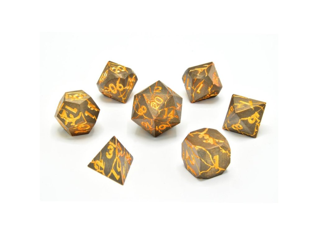 Tyto kostky jsou vyrobeny z pevného kovu. Cítí se těžké, opravdu, jsou těžké! Drží se pěkně v ruce a mají dlouhý a uspokojivý hod. Vyrobeno z prémiové hliníkově-zinkové slitiny, tyto kostky jsou postaveny na to, aby vydržely. Kovová konstrukce zaručuje trvanlivost a uspokojivou váhu v ruce. Tato sada obsahuje všechny standardní mnohostěnné kostky - d4, d6, d8, d10, d12, d20 a procentuální kostku (d10 označená desítkami). Obsahuje: 7 kostek.