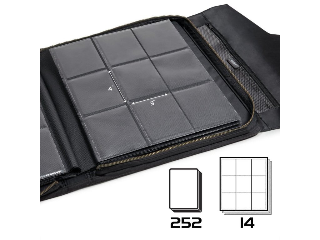 Album na karty TCG s vrchním načítáním, které nabízí robustní ochranu karet pro toploadery a zahrnuje úložiště pro příslušenství. - Kapacita karet: 252 karet - Kapsy: 9-kapsá side-loading - Exteriér: Tuhy pro maximální ochranu - Kapsa pro příslušenství: Pro tracker tagy, kostky, propisky.