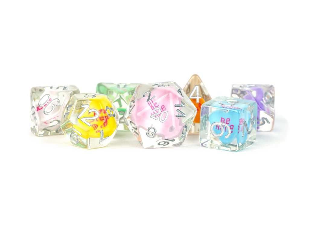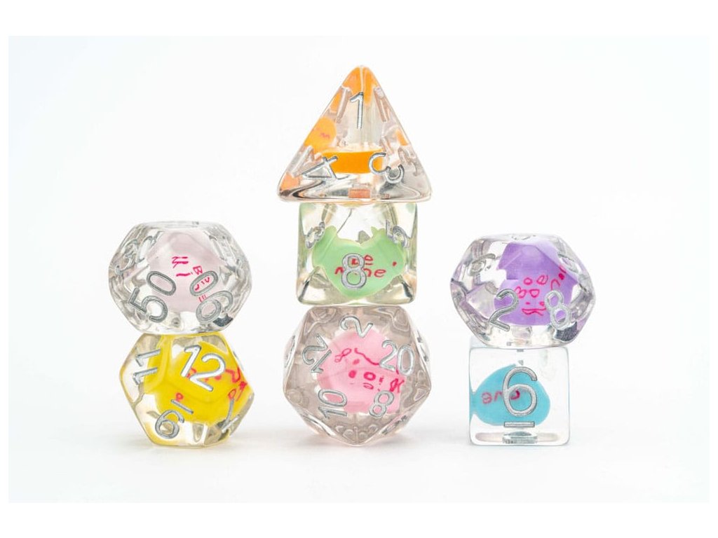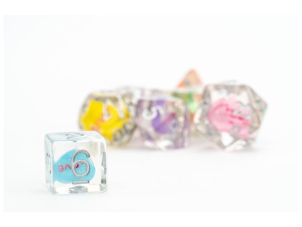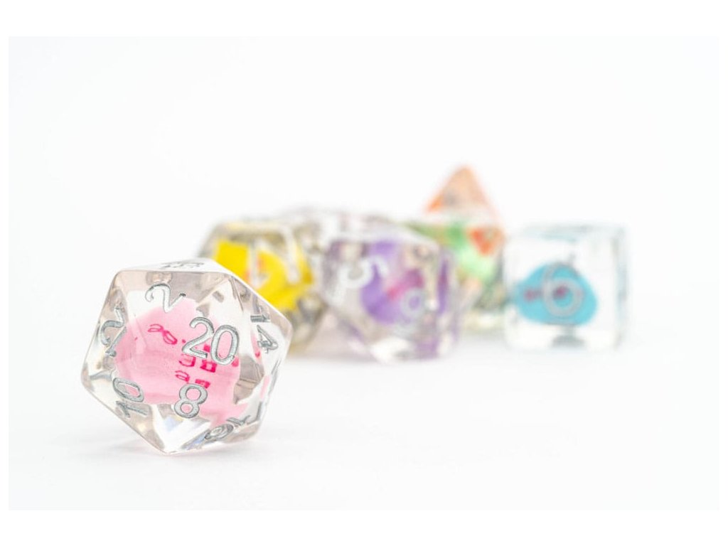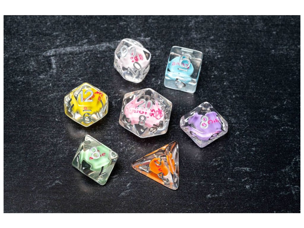 Pryskyřicové kostky FanRoll mají unikátní vložky, které dodají očarující vzhled každé herní tabuli. Jde o plnohodnotné sady polyedrických kostek o velikosti 16 mm, které obsahují 7 kostek (d4, d6, d8, d10, d10% (00-90), d12 a d20). Balení obsahuje: 7 kostek.