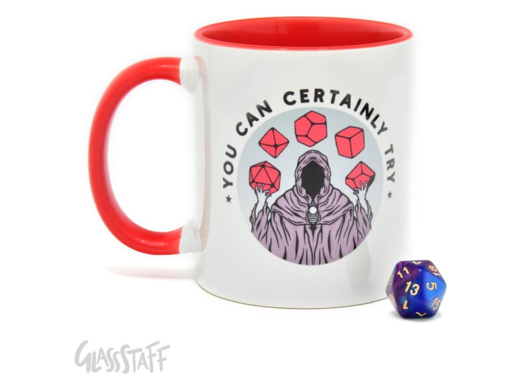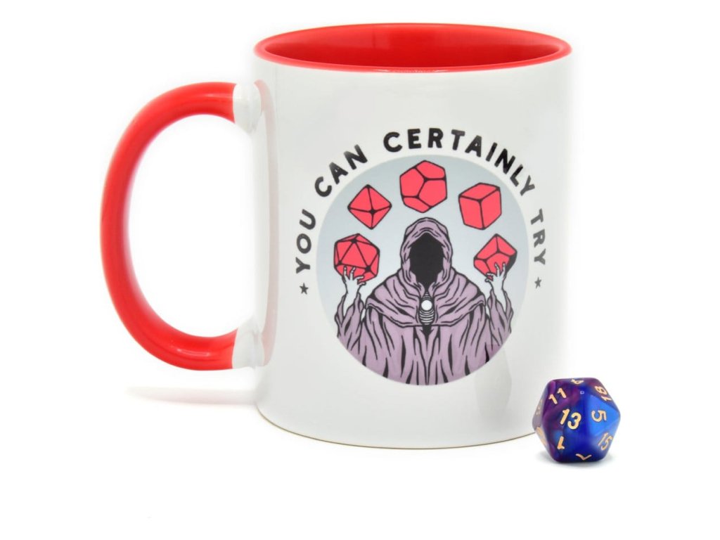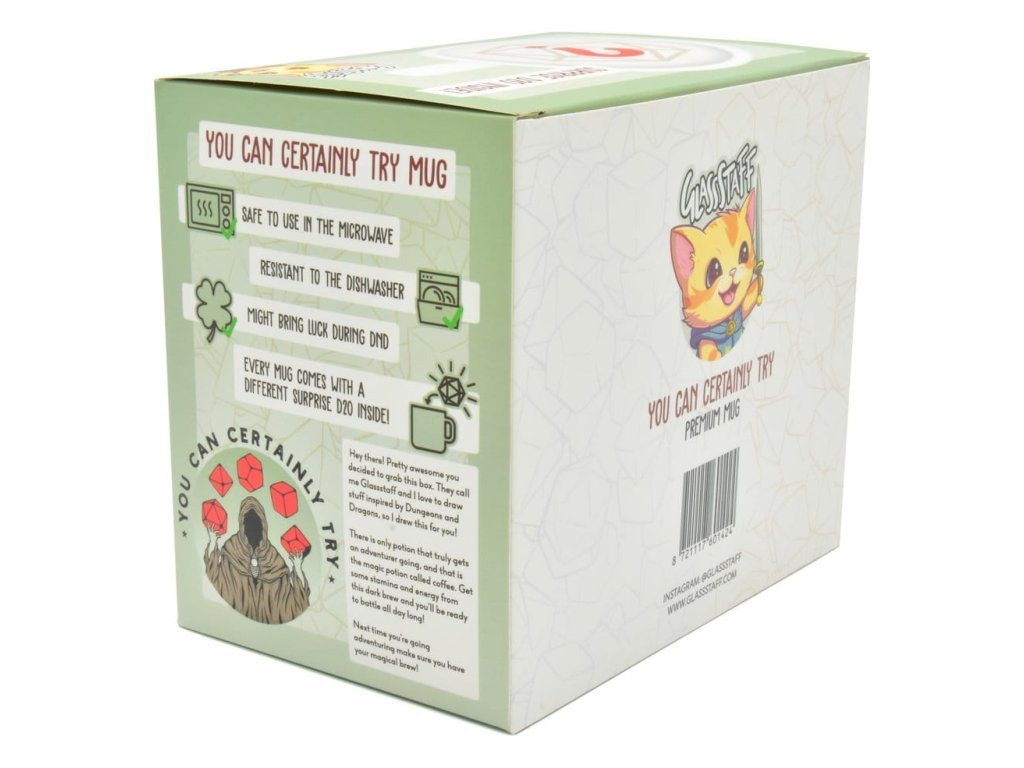 Když vás DM (Dungeon Master) vyzve slovy: 'Určitě to můžeš zkusit', je to věta, které se my, hráči, obáváme, ale zároveň nás neodradí to přesto zkusit. Nebo možná ano, pokud je následována otázkou 'Jsi si jistý?'. Prožili jsme to vše a máme design pro oba - hráče i dunheon mastery. Ať už je to nastrašení hráčů nebo na to, aby hráči zvedli svůj hrníček a stejně to zkusili.Tento DnD hrníček je perfektní na kávu, čaj a horkou čokoládu během těch intenzivních DnD sezení! Hrníček je potištěn vysoce kvalitní sublimační tiskem, což z něj dělá vysoce ceněný dárek pro každého milovníka horkých nápojů. Design je vytištěn na obou stranách hrníčku, takže si ho můžete užít vy i vaši spoluhráči! Tento hrníček je navržen speciálně s myšlenkou, že by mohl být dárkem pro vás, vaše spoluhráči, přátelé a rodinu. Každý hrníček je navíc doplněn malým dárkem v podobě D20 kostky, takže při každém popíjení svého nápoje budete moci hodit na iniciativu. Hrníček je dodáván v dekorativní krabičce s okénkem a je vyroben z keramiky, takže je vhodný do myčky i mikrovlnné trouby.