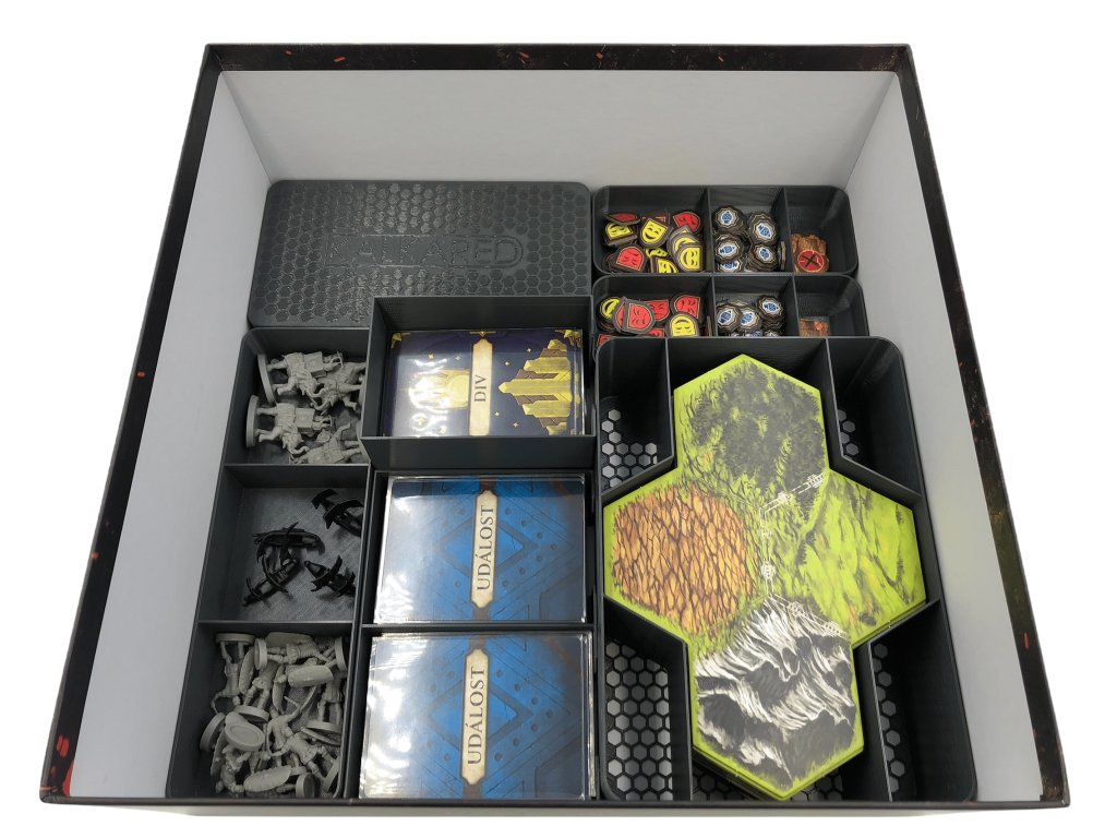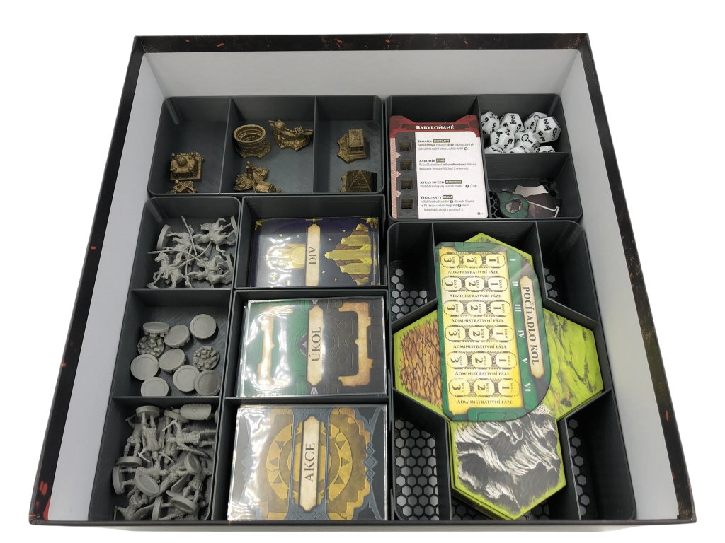 Praktický 3D tištěný insert pro deskovou hru Střet Civilizací: Monumentální vydání vám pomůže mít všechny komponenty pěkně uspořádané. Herní komponenty a karty nejsou součástí balení. Insert se skládá z: 4 x Hlavní uložiště na figurky hráče 4 x Doprovodné uložiště pro figurky a kostičky hráče 4 x Víko na Hlavní uložiště komponent hráče 1 x Hlavní uložiště na dílky mapy 2 x Krabička na žetony hry 2 x Krabička na hrací karty 1 x krabička na karty Vůdců a Divů 2 x Krabička na figurky barbarů 2 x krabička na divy a buffer 1 x Krabička na přípravu hry Návody: Vizuální návod CZ/EN Textový návod k používání a údržbě CZ/EN