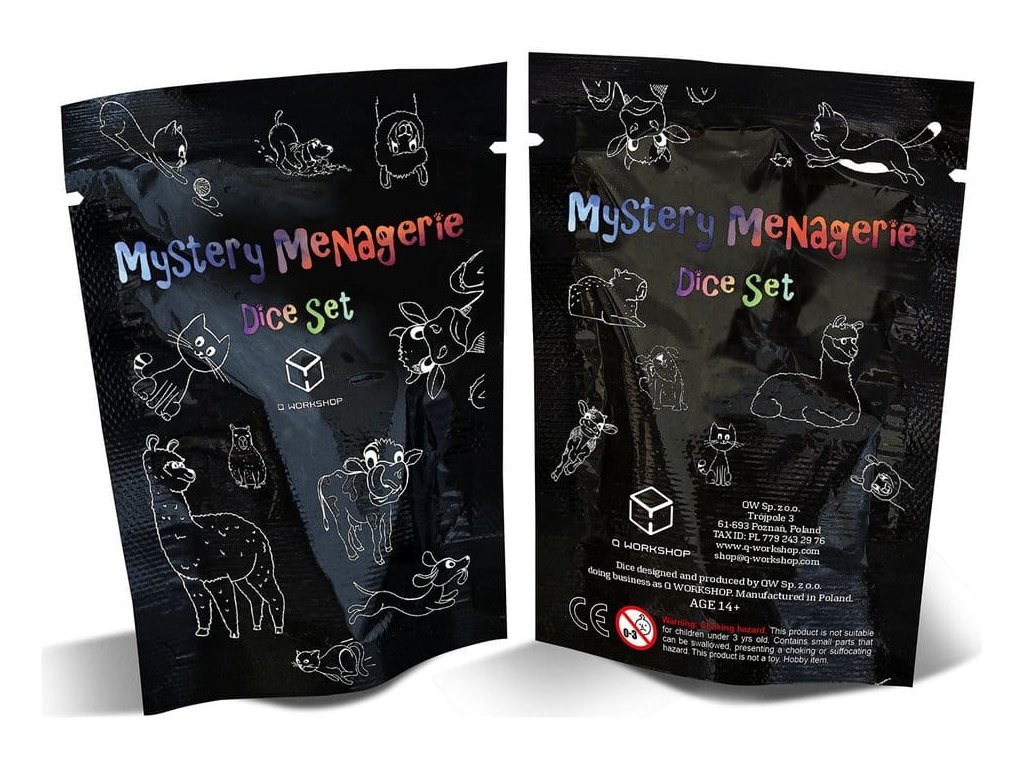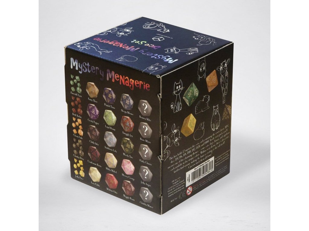 Krabice s 12 sadami tajemných kostek. Tato krabice obsahuje 12 sad tajemných kostek, každá obsahuje sedm klasických RPG kostek: D1, D6, D8, D10, D12, D20 a D100. Uvnitř každého balíčku objevíte jedno z pěti okouzlujících témat - krávy, kočky, psy a lamy - každé je k dispozici ve pěti jedinečných barvách. Uvnitř každého tématu je také vzácná, těžko naleznutelná varianta, což dělá hledání stejně vzrušující jako samotný hod! Dokážete je všechny vystopovat?