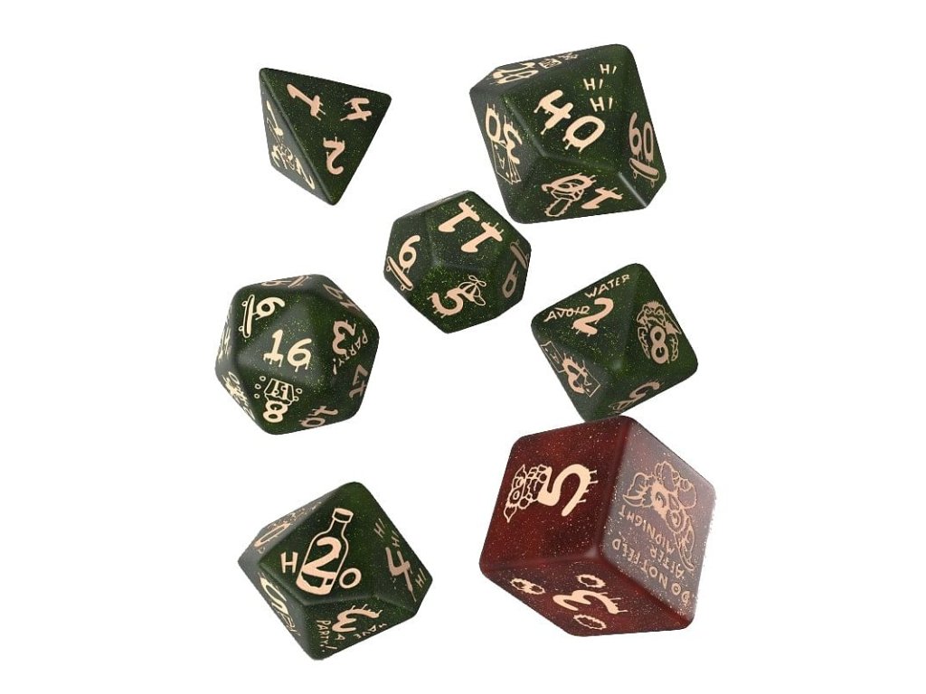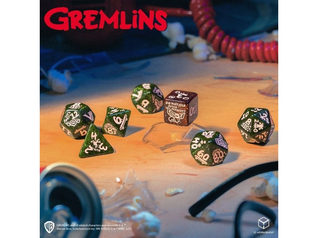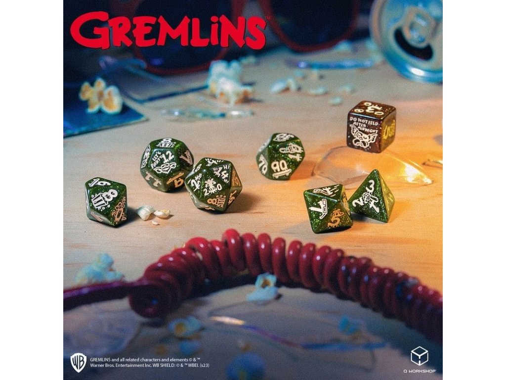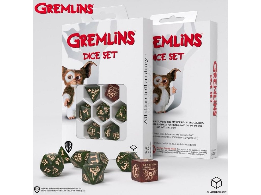Sada obsahuje 7 mnohostěnných kostek s grafikou kultovních komediálních hororů Gremlins. Šestice kostek má třpytivě zelenou barvu a najdete na nich zlomyslné Gremliny, šestistěnka je pak třpytivě měděná a zdobí ji roztomilý Gizmo. Kostky pro vaši oblíbenou hru na hrdiny nebo deskovku! Balení obsahuje 1x čtyř, 1x šesti, 1x osmi, 1x desíti, 1x dvanácti, 1x dvaceti stěnnou a 1x procentovou kostku. Držte je dál od vody a nekrmte po půlnoci.