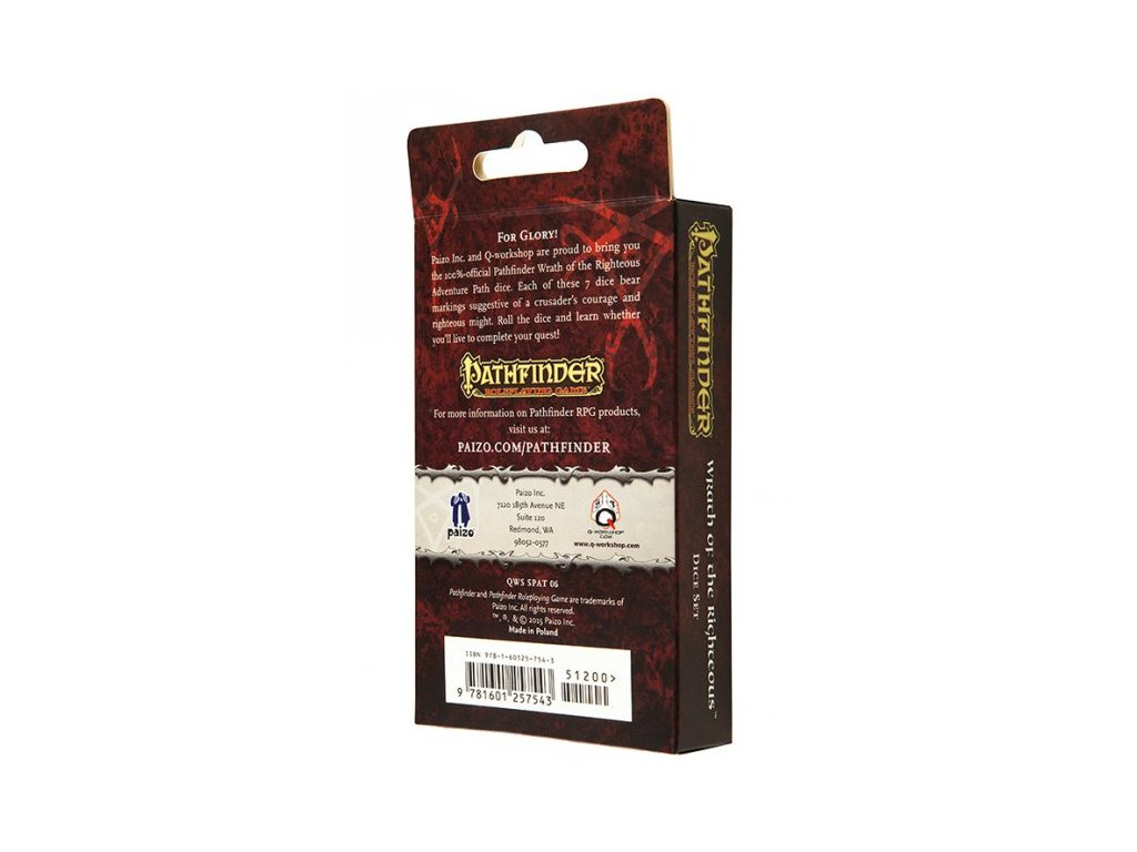Sada sedmi precizně vyvedených kostek vyrobených na motivy dobrodružství Wrath of the Righteous pro hru Pathfinder. Sada obsahuje: čtyř, šesti, osmi, desíti, dvanácti, dvaceti stěnnou a procentovou kostku.Doplňkové parametry