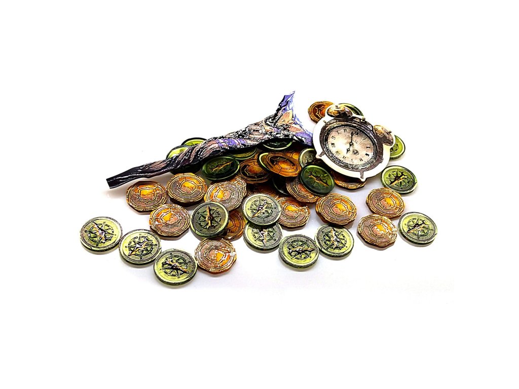 V sadě najdeš 57 žetonů pro deskovou hru Ztracený ostrov Arnak (Lost Ruins of Arnak) a její rozšíření Velitelé expedic (Expedition Leaders). Žetony jsou z plexiskla a nahrazují původní kartonové. Žetony se svými rozměry hodí do všech insertů od společnosti e-Raptor, jako je např. tento. Obsah balení: 2 Moon Staffs 1 žeton začínajícího hráče 27 žetonů kompasu 27 žetonů mincíDoplňkové parametry