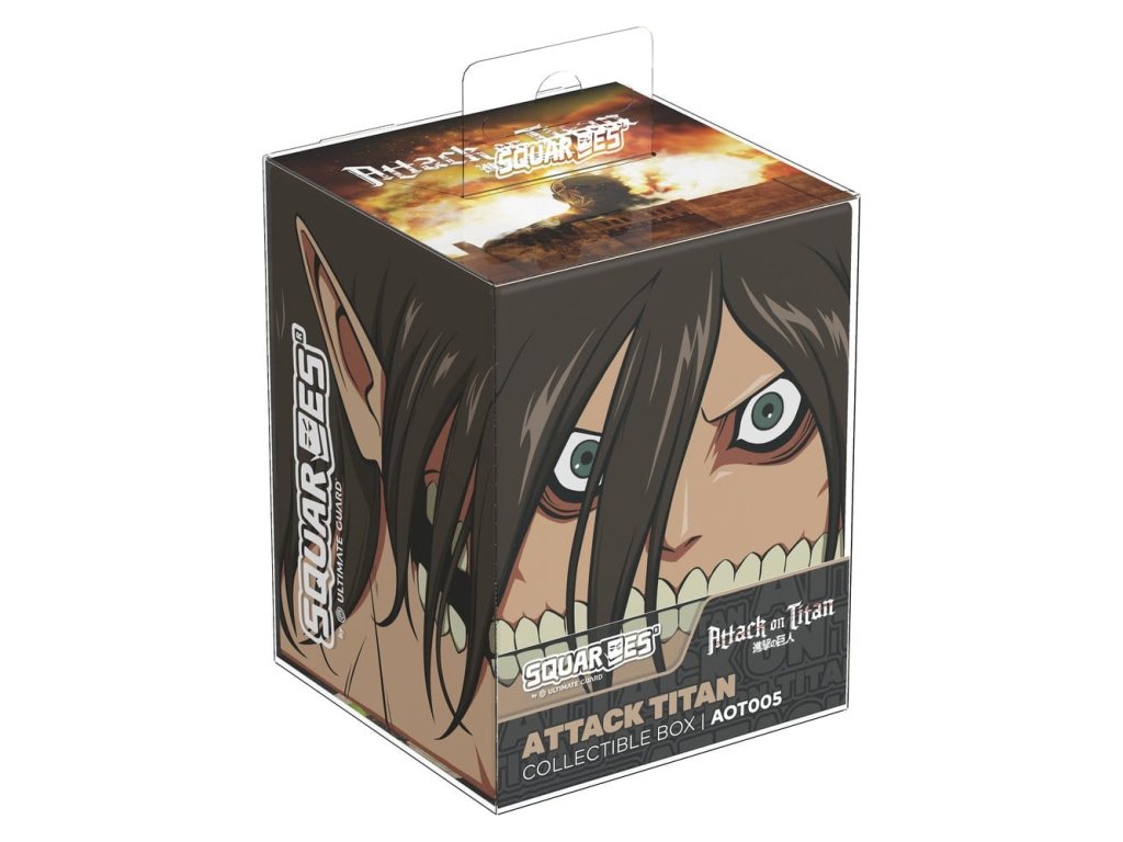 Sběratelská krabice pro ukládání balíčků TCG, příslušenství pro stolní hry a / nebo sběratelských předmětů. Attack Titan Squaroe z edice Attack on Titan pojme až 100 karet v dvojitých ochranných obaloch, pokud je použit jako box na balíčky. Squaroes jsou vyrobeny z 78% obnovitelných zdrojů a dokonale se vejde do samostatně dostupného kolektorského kufříku.