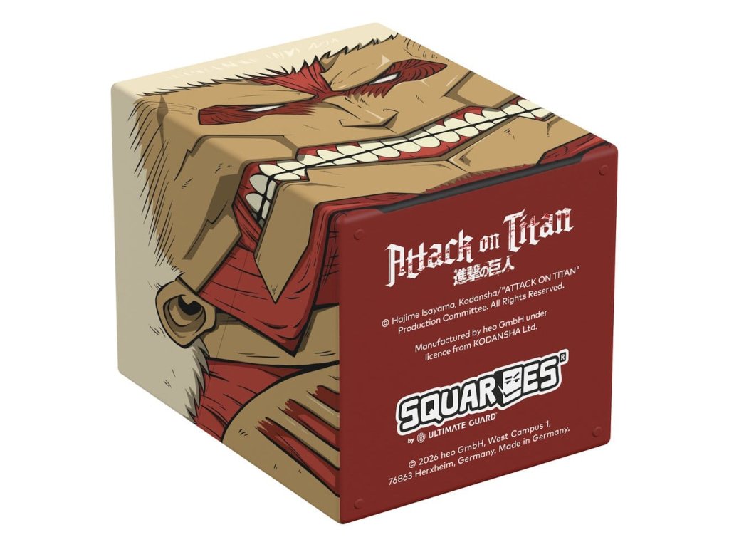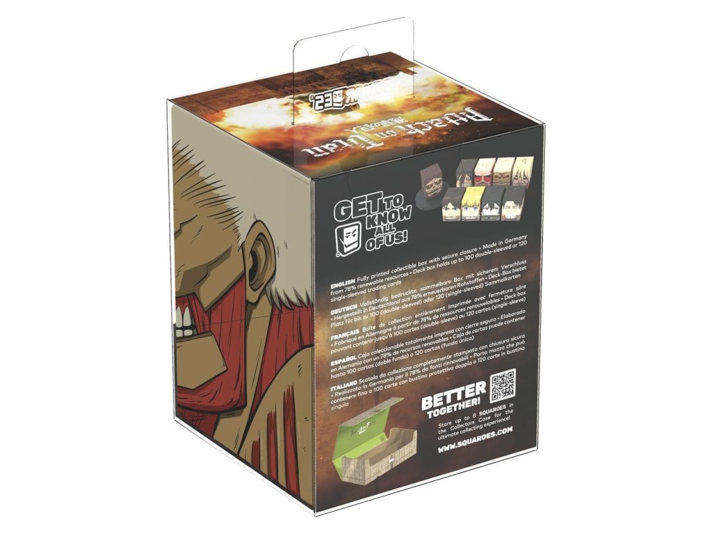 Sběratelská krabice pro ukládání balíčků TCG, příslušenství pro stolní hry a/nebo sběratelských předmětů. Obrněný Titan Squaroe z edice Attack on Titan pojme až 100 karet v dvojitých ochranných obalech, pokud je použit jako krabice na balíčky. Squaroes jsou vyrobeny z 78% obnovitelných zdrojů a dokonale zapadají do samostatně dostupného sběratelského pouzdra.