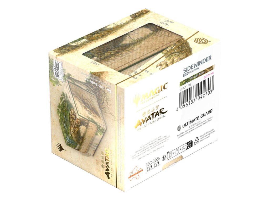 Sidewinder 100+ víyo z odolného materiálu Xenoskin pojme až 100 dvojitě obalených karet, které jsou v krabičce na karty bezpečně uchovány díky silnému magnetickému uzávěru a jemnému vnitřnímu podšívce z mikrovlákna. Odolný, vysoce kvalitní povrch Sidewinderu z materiálu Xenoskin je potištěný v plné barvě oficiálně licencovanými obrázky ze sady Magic: The Gathering | Avatar: Poslední vládce větru.