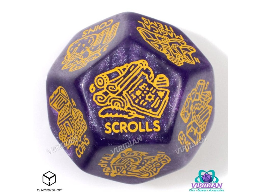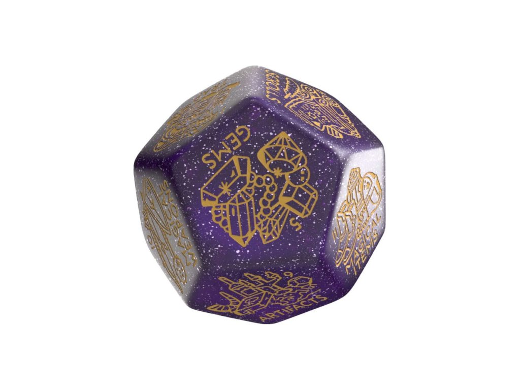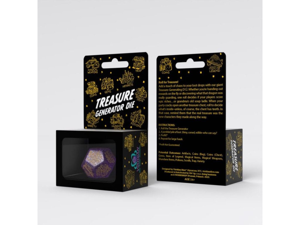Bohatství nebo zkáza? Generátor Pokladů je obří kostka D12 navržená společností Viridian Dice, připravená náhodně generovat lup, relikvie a odměny pro dobrodruhy. Každý hod odkryje štěstí (nebo neštěstí) uvnitř - od obyčejných předmětů až po artefakty legendy. Dokonalé pro spontánní vytvoření pokladů a přípravu hry. Velká odměna - Obří kostka D12, vyrytá dvanácti kategoriemi lupů, co inspirují odměny, zvraty v příběhu nebo tabulky pokladů. Truhla Bojatství - Vyhodit a objevit: Past, Běžné Předměty, Mince, Mince+, Drahokamy, Lektvary, Svitek, Různorodost, Artefakty, Magické Zbraně, Magické Předměty, nebo Předmět Legendy. Kontrastní Barvy - Dokonale čitelné a vizuálně nápadné barvy, třpytivě fialová a zlatá. Snadno Čitelné - Jasné, hluboce vyrytý text zajišťuje čitelnost při šerém světle louče nebo napříč stolem. Skvělá Spolupráce - Kostka Generátor Dungeonů je vyprodukována společností Q WORKSHOP v Polsku, EU, vytvořená společností Viridian Dice a nyní je k dispozici na širších distribučních kanálech.