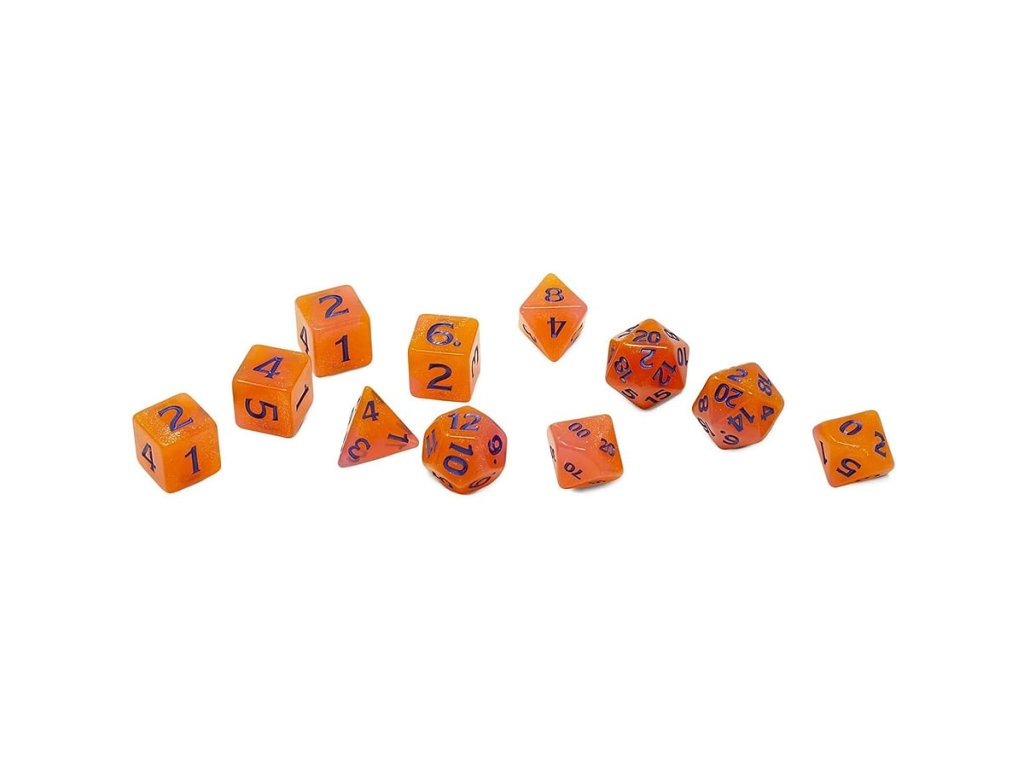 Krásný set 11 kostek (2-d20, 1-d12, 2-d10, 1-d8, 4-d6, 1-d4) pro hru Dungeons & Dragons.