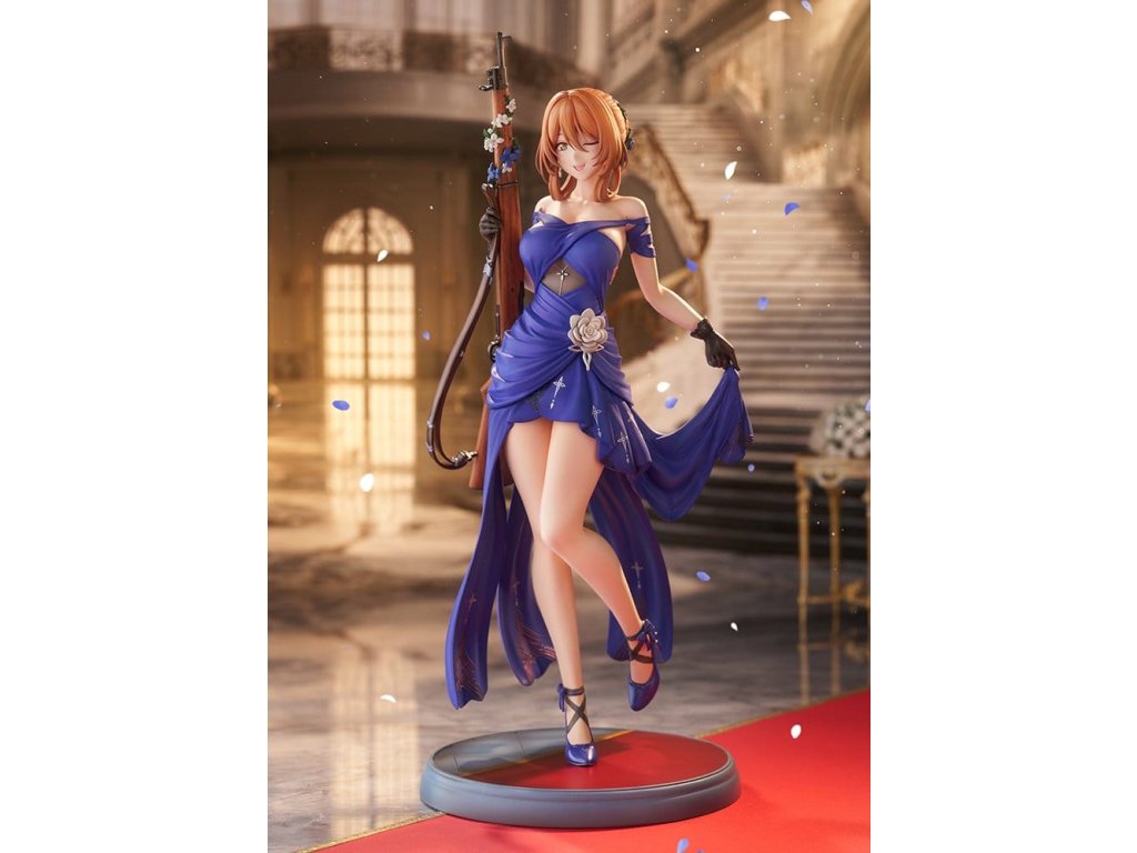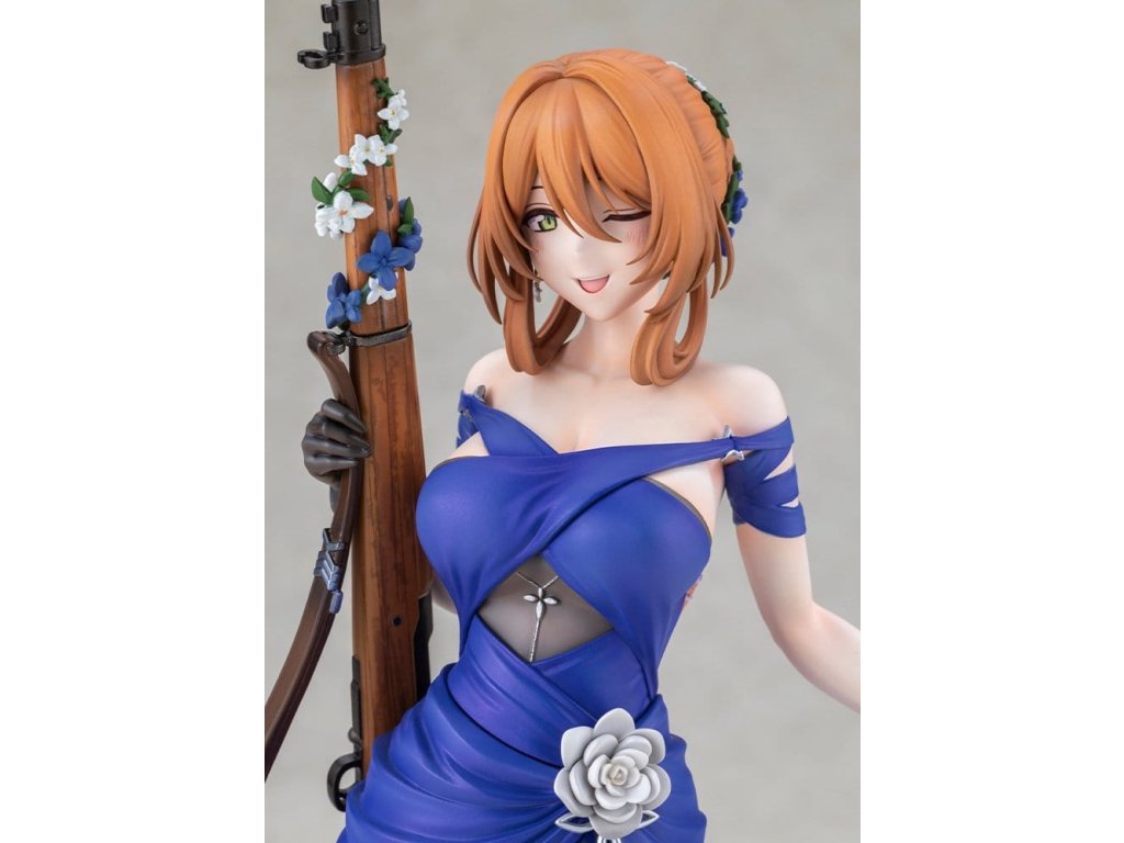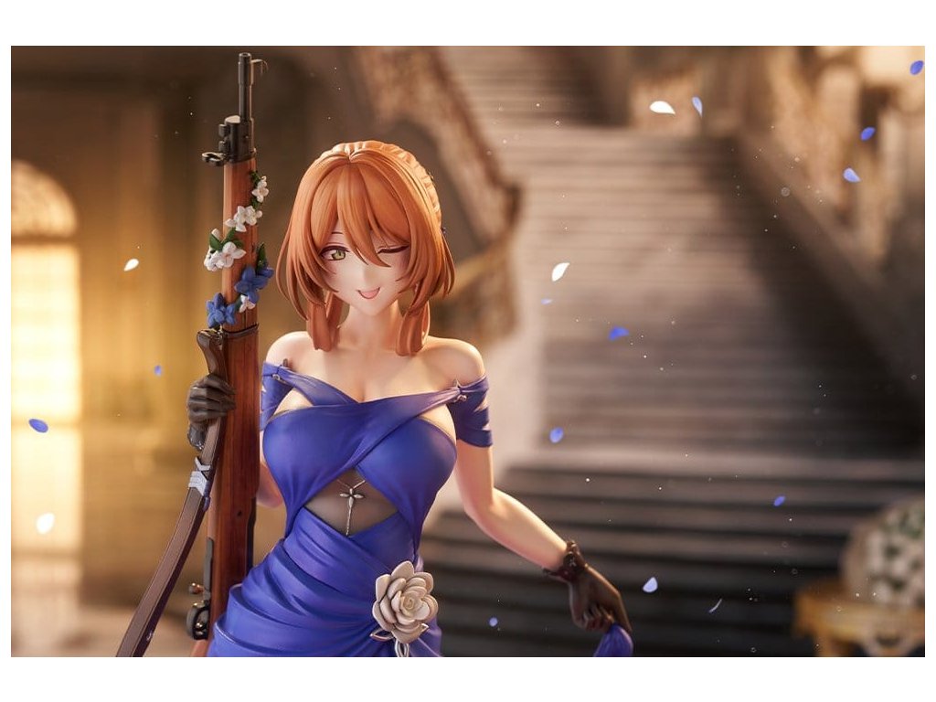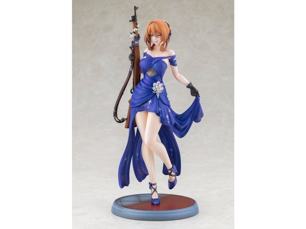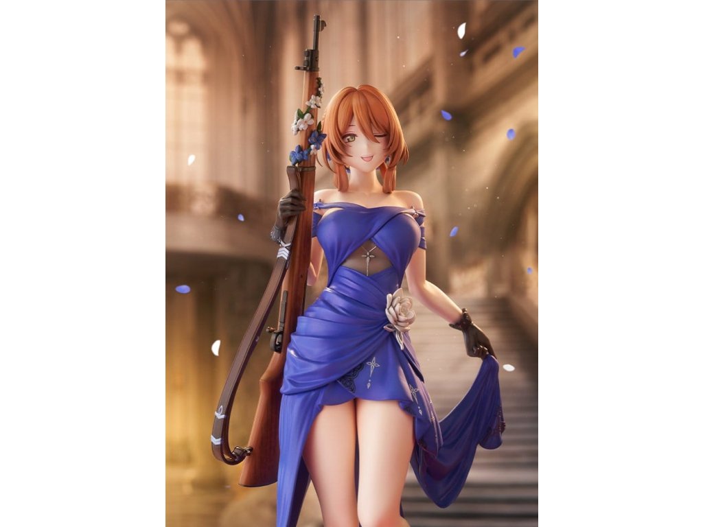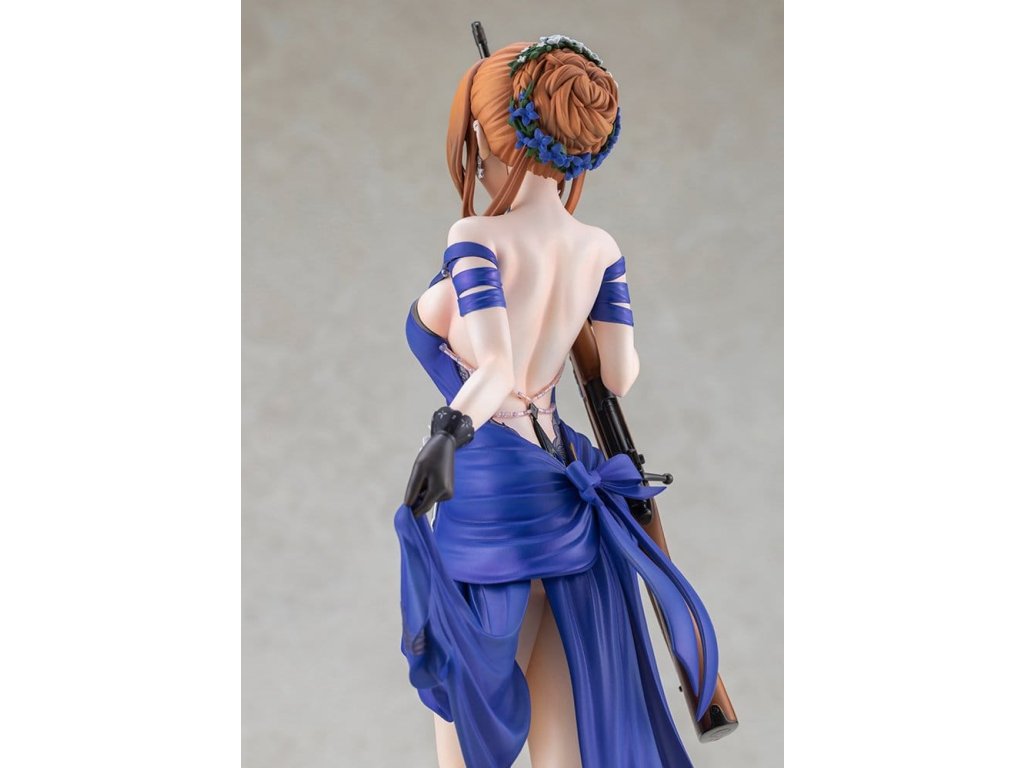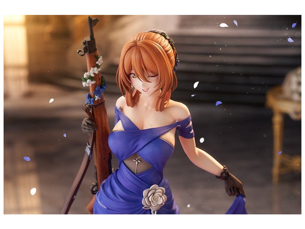 Springfield, jemná a rozhodná manažerka kavárny Zucchero z DÍVČÍ FRONTY 2: EXILIUM, je nyní k dispozici jako figura ve svém nádherném šatovém oblečení! Její póza je definicí elegance a grácie, jako by právě vycházela z taneční sály. Její roztomilé mrknutí je také okouzlující! Výrazné modré šaty jsou dokončeny ostrými záhyby a mírně posunutou perleťovou barvou, což jim dodává pocit luxusu. Určitě si všimněte odvážně otevřeného zadního dílu a elegantních tělesných linií kolem pasu. Distinktivní účes do nádherného drdolu, jemné květinové ozdoby a šperky, a dokonce i dřevěné zrní a kovové kování pušky byly pečlivě rekonstruovány až do nejjemnějších detailů. Nezmeškejte šanci přivítat ji ve své sbírce, velitelko!