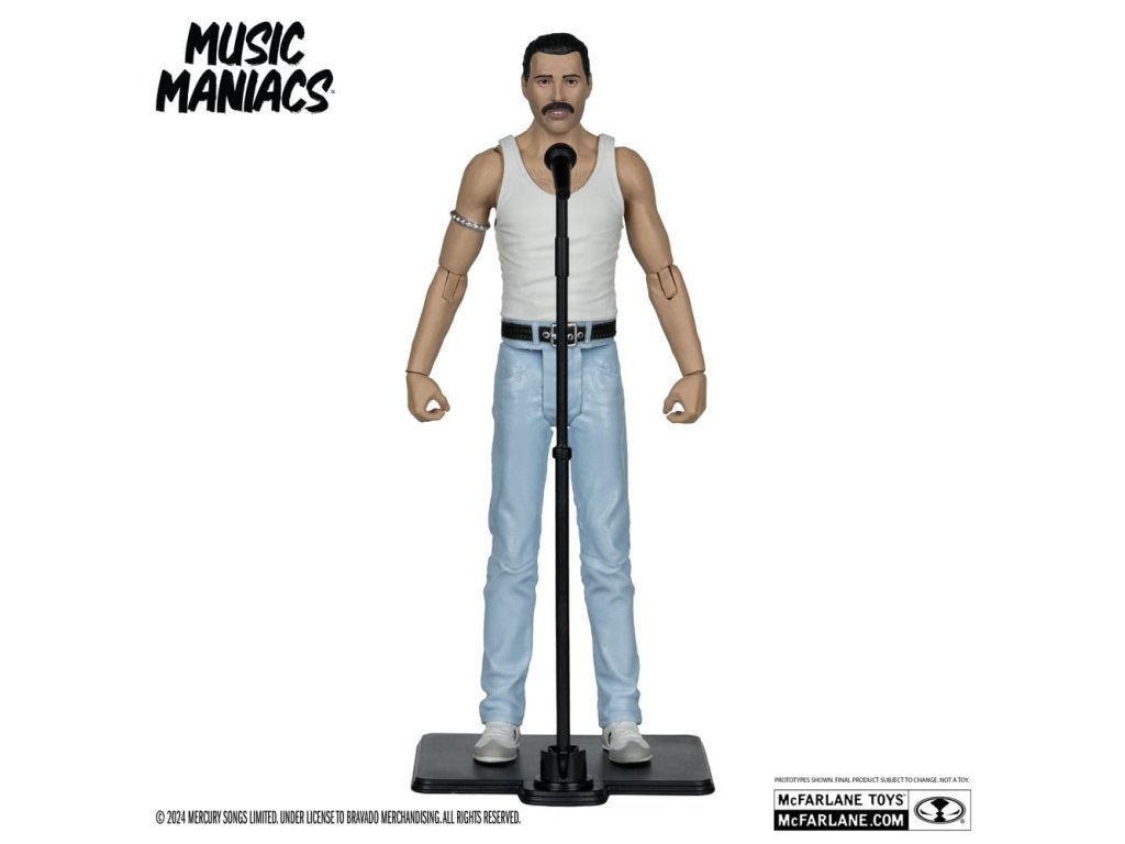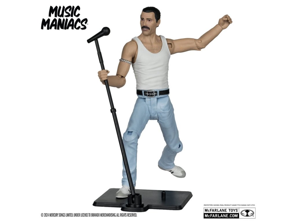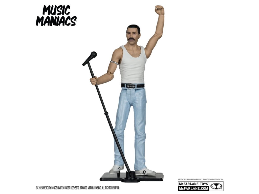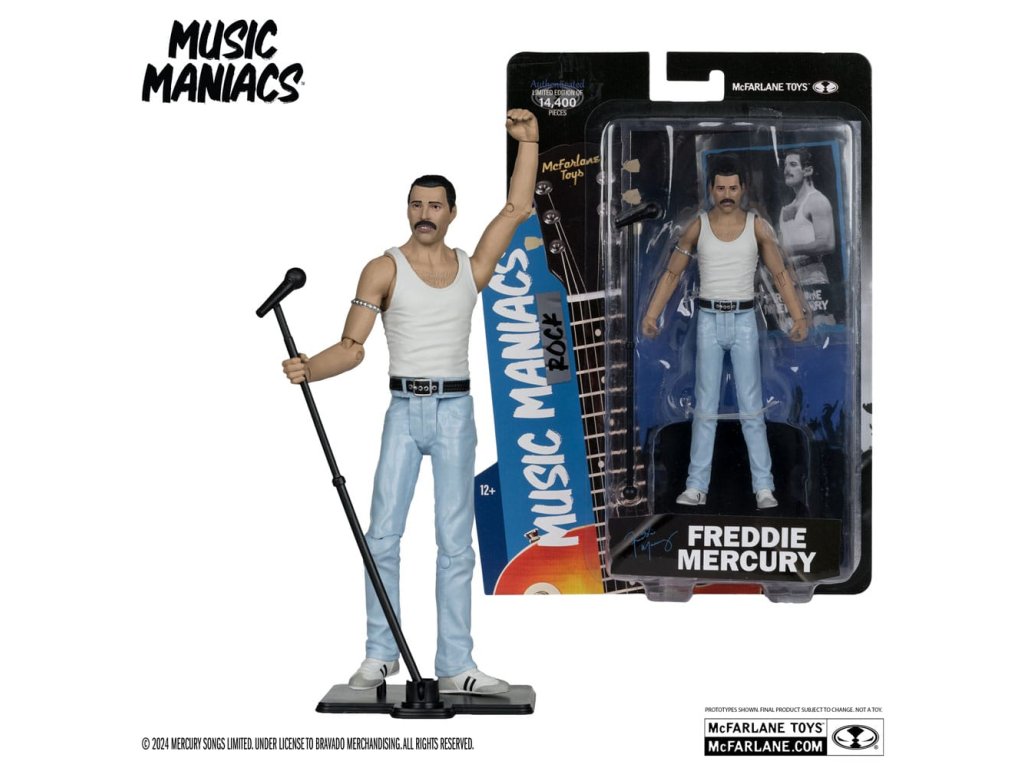 Figurka Freddie Mercuryho na základě jeho vzhledu z vystoupení Live Aid 1985. - Neuveritelně detailní figura ve velikosti 6' s podobností FREDDIE MERCURY - Navrženo až s 12 body artikulace pro pózování a hraní - Příslušenství Freddie Mercury zahrnuje mikrofon a stojan na mikrofon - Obsahuje uměleckou kartu s číslovaným certifikátem pravosti.