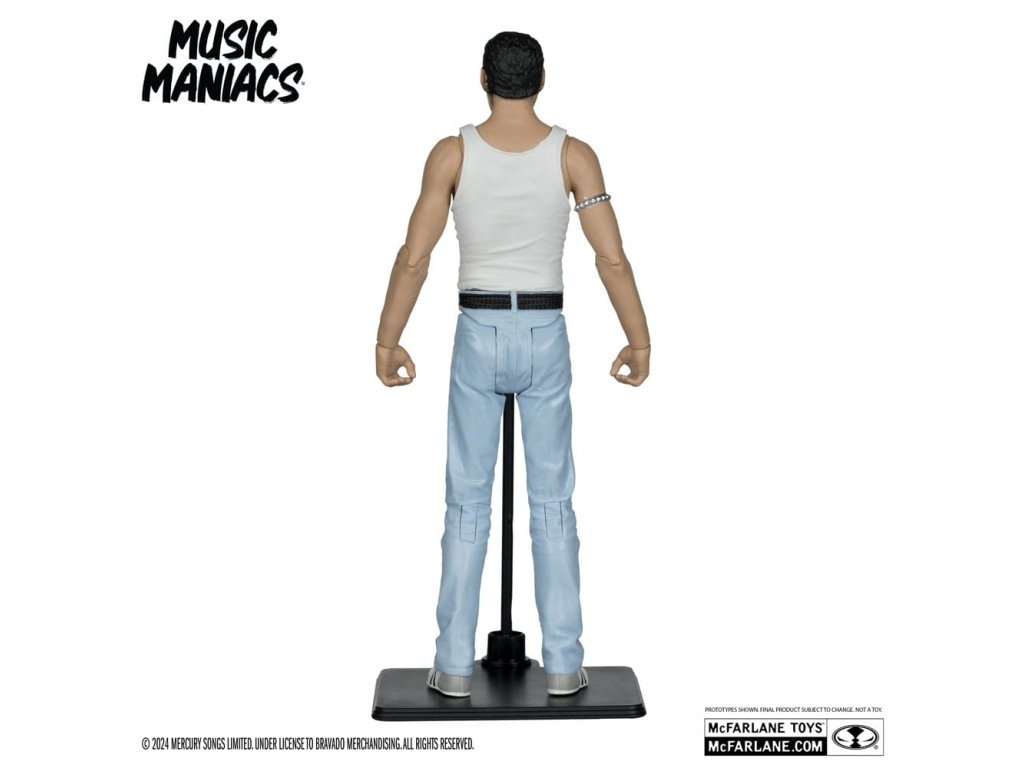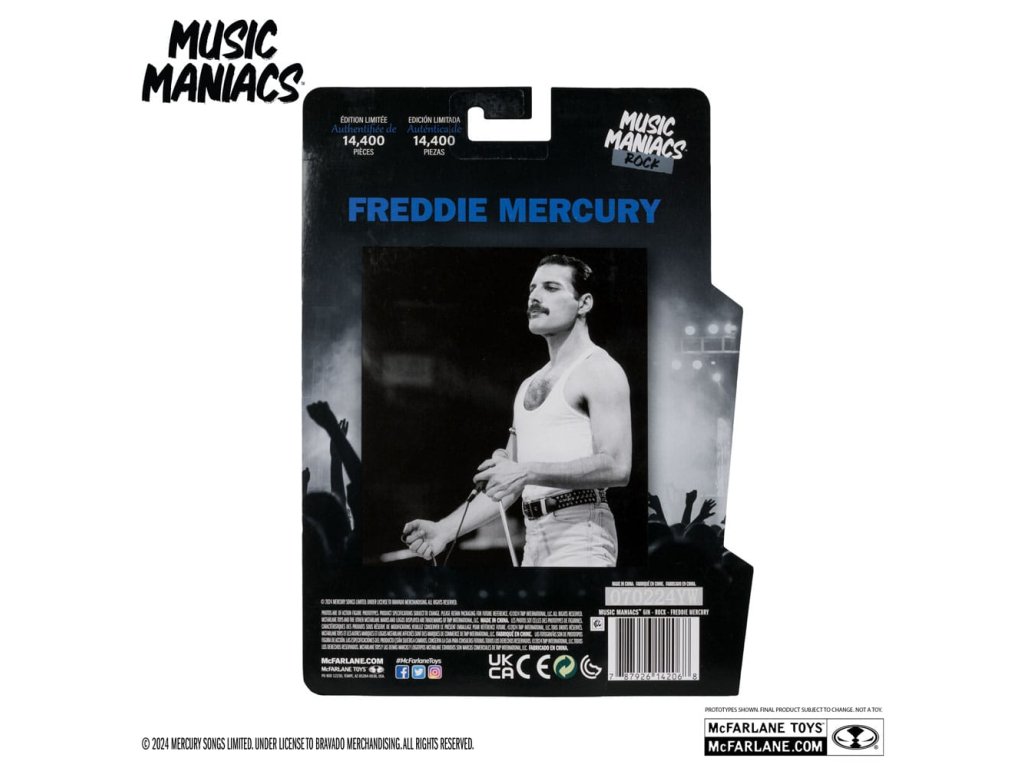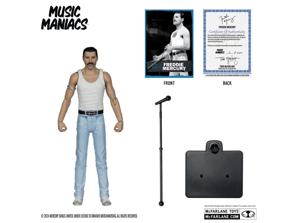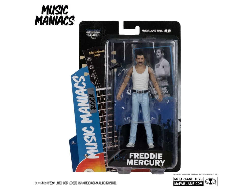 Figurka Freddie Mercuryho na základě jeho vzhledu z vystoupení Live Aid 1985. - Neuveritelně detailní figura ve velikosti 6' s podobností FREDDIE MERCURY - Navrženo až s 12 body artikulace pro pózování a hraní - Příslušenství Freddie Mercury zahrnuje mikrofon a stojan na mikrofon - Obsahuje uměleckou kartu s číslovaným certifikátem pravosti.