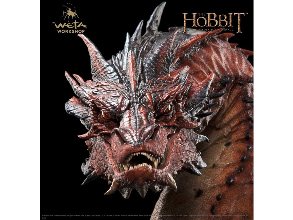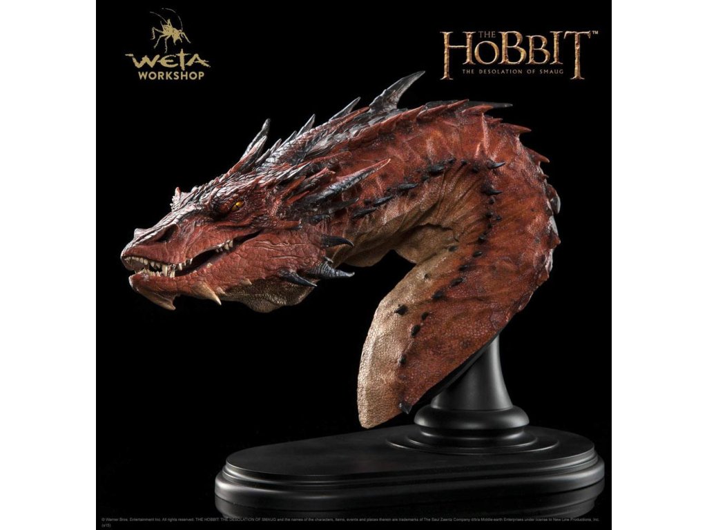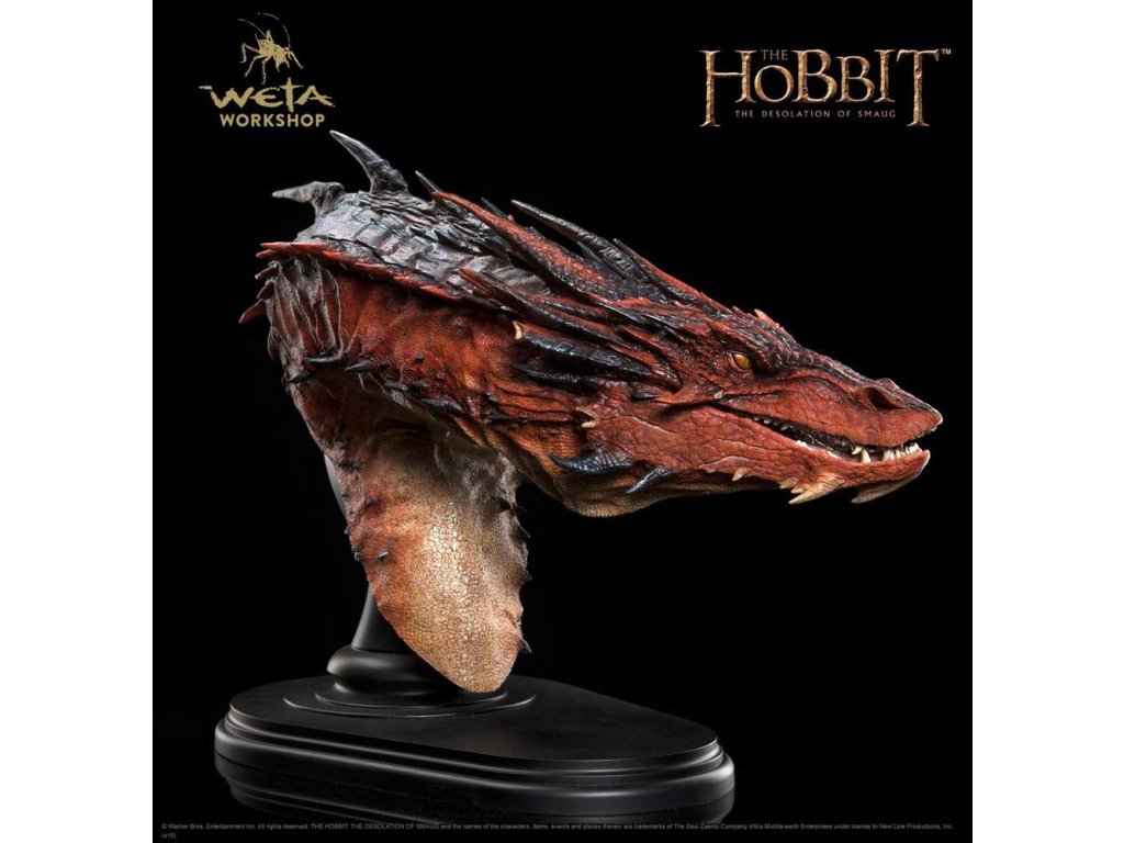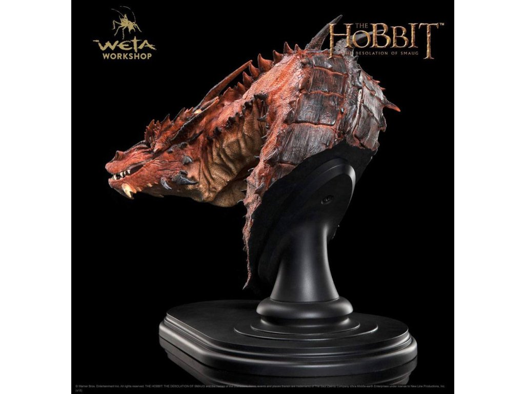 V temném údolí pod samotnou horou je vše ticho. Horký klid leží na ohromné poušti zlata a pokladů, které pokrývají dříve rušné haly starobylého trpasličího města; poklad bez rovného ve Středozemi, ale který se nepozorovaně lidským okem třpytí. Neboť bohatství Ereboru není bez stráže. Mnoho desetiletí uplynulo od doby, kdy dračí Šmaugova chuť a touha po zlatě ho vedly na jih z Opatství ke království trpaslíků. Bylo to rychlé a strašné příchod, které mělo za následek nesčíslné množství mužů a trpaslíků zemřelých v ohni a ruinách. Teď je však vše v halách spícího draka ticho, jak leží serpentovitě ve svém pokladu. Ale tento klid je iluzí, protože dračí mysl nikdy neodpočívá. Horečnaté sny o zlodějích a uzurpátorech z jeho spánku dělají rozzlobený spánek, oči se náhle otevírají, aby se rychle pohybovaly tam a zpět, dlouhý hadí krk náhle vystupuje, aby se otočil, počítá mince a poháry, talíře a šperky posázené drahokamy, jeho smysly jsou laděné na nejmenší náznak vůně nebo tichého kroku, který by mohl ohlásit vniknutí nějakého chamtivého, nezodpovědného blázna. Šmaug nesdílí žádný kousek svého pokladu a jak nesmírně velký a mocný je, pochybnosti mu žerou do sebevědomí, tříští mu rozum a odsuzují ho k nervóznímu, rozbitému, rudě žhavému spánku. Do této kysející jámy podezření a hněvu se opatrně zařehtává hobit bez myšlenky na poklad. Hnaný svou povinností splnit naivní slib příteli a prokázat se jako hodný důvěrym kouzelníků, Bilbo Pytlík nervózně šlape po posvátném zlatu. Jednoduchý akt úžasné odvahy pohání každý nervózní krok, který způsobuje průtok mincí, který se stává lavinou, sesuvem půdy ze zlata, který zase uvolní na svět monstrózní hněv, změní běh dějin a zapříčiní krátké a krvavé obléhání: protože Bilbo probudil draka. - Hlavně vyrobeno z polystone; - Zobrazuje hlavu a krk mocného draka Šmauga, jak je vidět v Hobitovi; - Perfektně velký, aby byl z každého detailu patrný strach a divokost; - Otočení o 180° umožňuje jak stojící zobrazení, tak i montáž na zeď; - Sochařil veterán z Weta Workshopu Andrew Baker. Rozměry: 36 cm x 46 cm x 24 cm.