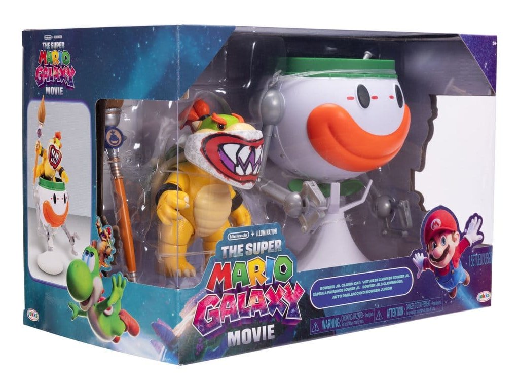 Bowser Jr. působí chaos po celé galaxii! Bowser Jr. s klaunským autem z filmu Super Mario Galaxy je ideální způsob, jak způsobit chaos! S exkluzivní maskou má Bowser Jr. 17 bodů artikulace. Jeho klaunské auto má tlačítkem aktivované údery rukou, otáčející se vrtuli a odnímatelnou rukojeť. Přiložené doplňky: štětec se houbičkou, ark s nálepkami, které se objeví po kontaktu s vodou, a podstavec pro klaunské auto. - 5" Bowser Jr. s exkluzivní maskou - Bowser Jr. má 17 bodů artikulace - Klaunské auto má tlačítkem aktivované údery rukou, otáčející se vrtuli a odnímatelnou rukojeť - Doplňek štětec se houbičkou - Ark s nálepkami, které se objeví po kontaktu s vodou - Podstavec pro klaunské auto - Vhodné pro děti od 3 let.
