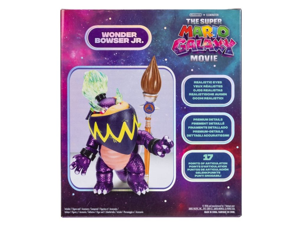 Sbírejte své oblíbené postavy z filmu The Super Mario Galaxy v sérii figurek o velikosti 5''. Figurka Wonder Bowser Jr. je inspirována filmem a její detaily jsou vysoce kvalitní, včetně 17 bodů pohyblivosti. Wonder Bowser Jr. je dodáván s příslušenstvím v podobě štětce a je prezentován v průhledné krabici. První vlna obsahuje Mario, Yoshi, Rosalina a Bowser Jr. Můžete je sbírat všechny! - Figurka Wonder Bowser Jr. o velikosti 5'' s vysoce kvalitními detaily - 17 bodů pohyblivosti - Příslušenství štětec - Vhodné pro děti od 3 let - Prodává se jednotlivě.
