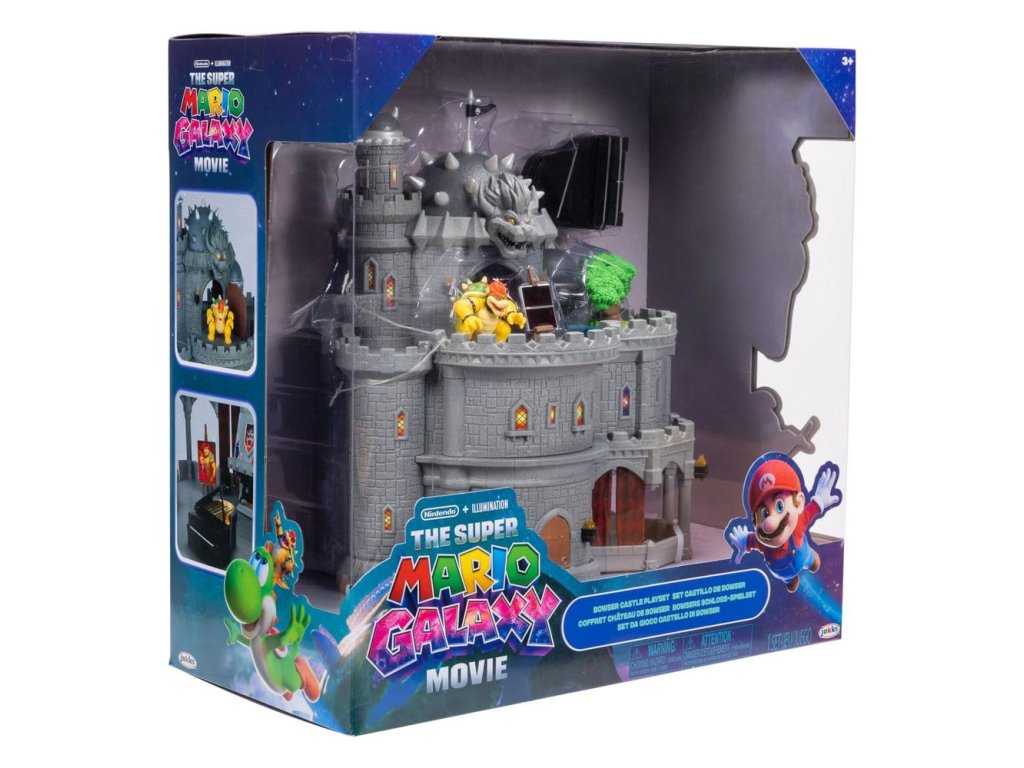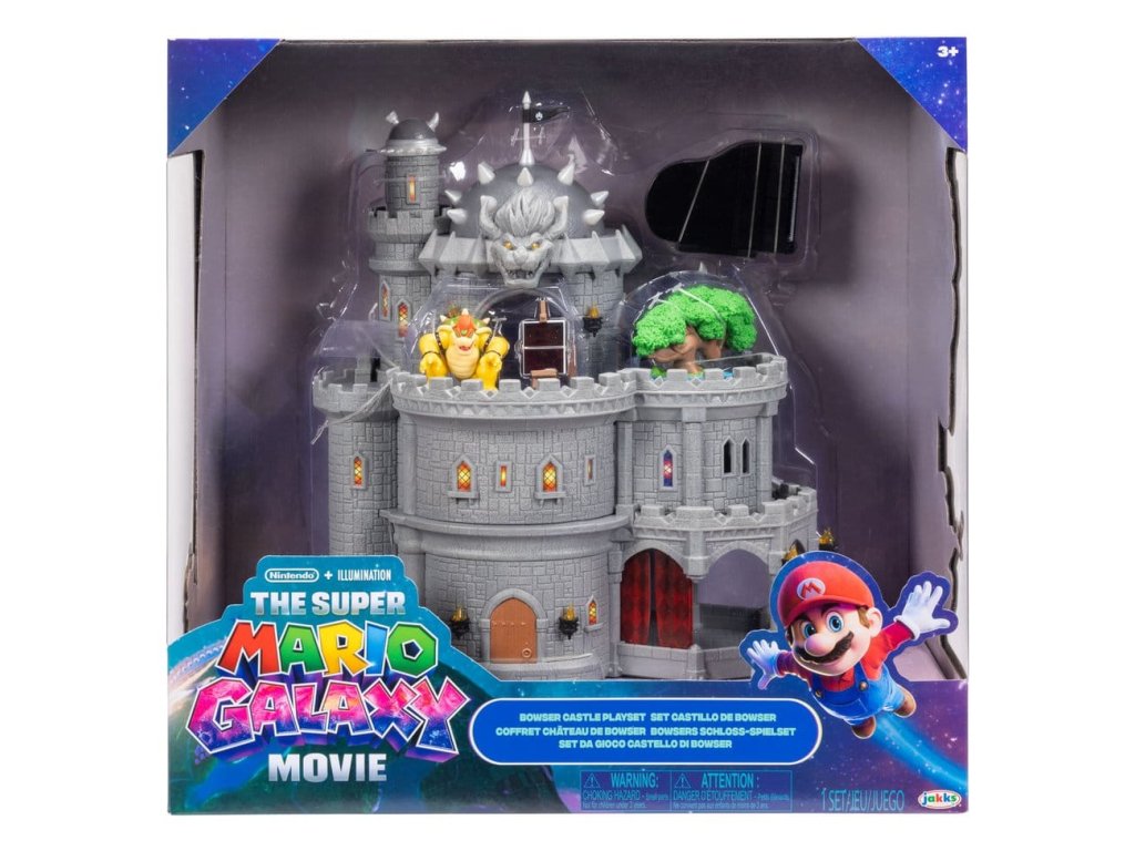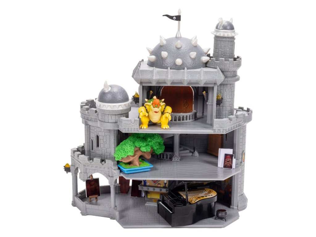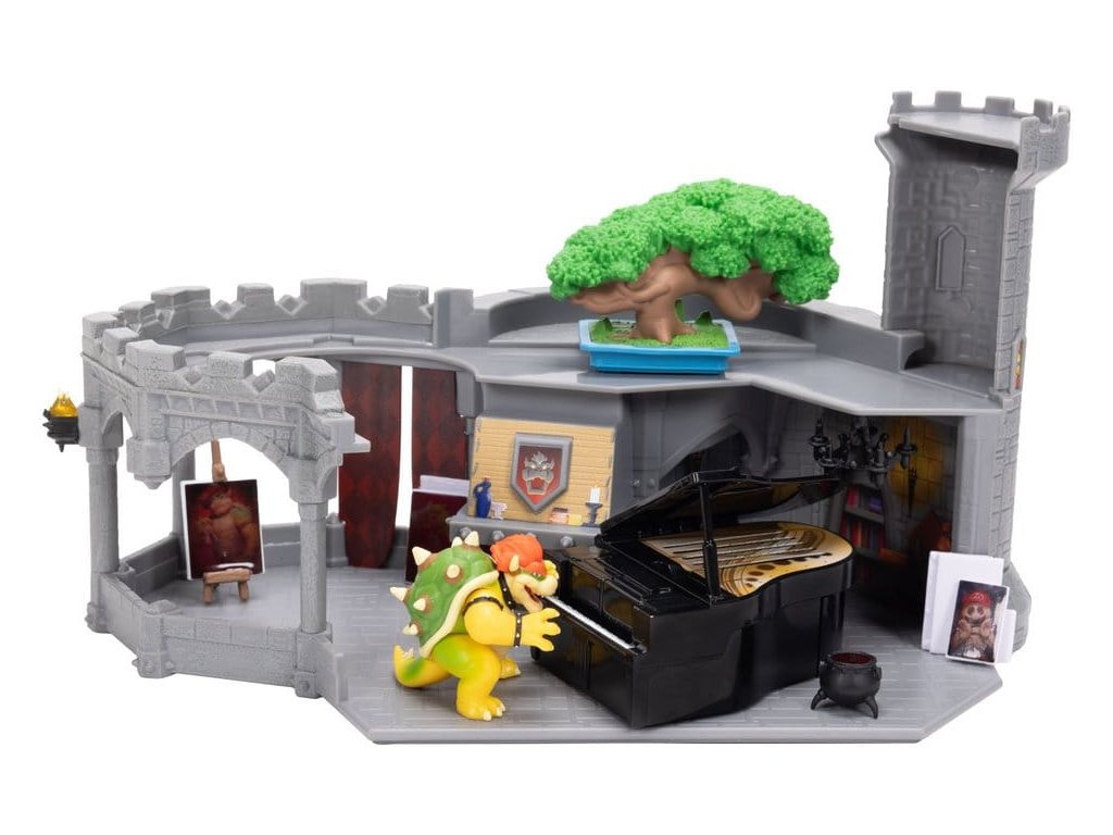 Deluxe hračkový set filmu Super Mario Galaxy je vhodný pro krále velikosti mini! Hrad je třípatrový s vnějším a vnitřním prostorem a lze ho rozdělit pro boční hru. Mezi vlastnosti hradu patří otočná vrcholová věž, vyklopné dveře a krb. Je to dokonalé prostředí pro Bowsera, aby zůstal zaměstnán, když hraje na klavír s dvěma tlačítky na zvonkohru, maluje s pomocí mnoha obrázků aktivovaných teplem a kádí nebo pěstuje svoji bonsai. - 12" Deluxe Bowserův hrad - Třípatrový hračkový set lze rozdělit pro boční hru - Příslušenství zahrnuje klavír s dvěma tlačítky na zvonkohru a bonsai - Pět obrázků objevujících se teplem a káď - Obsahuje 1,5" figurečku Bowsera se 3 body ohybu - Pro děti od 3 let.