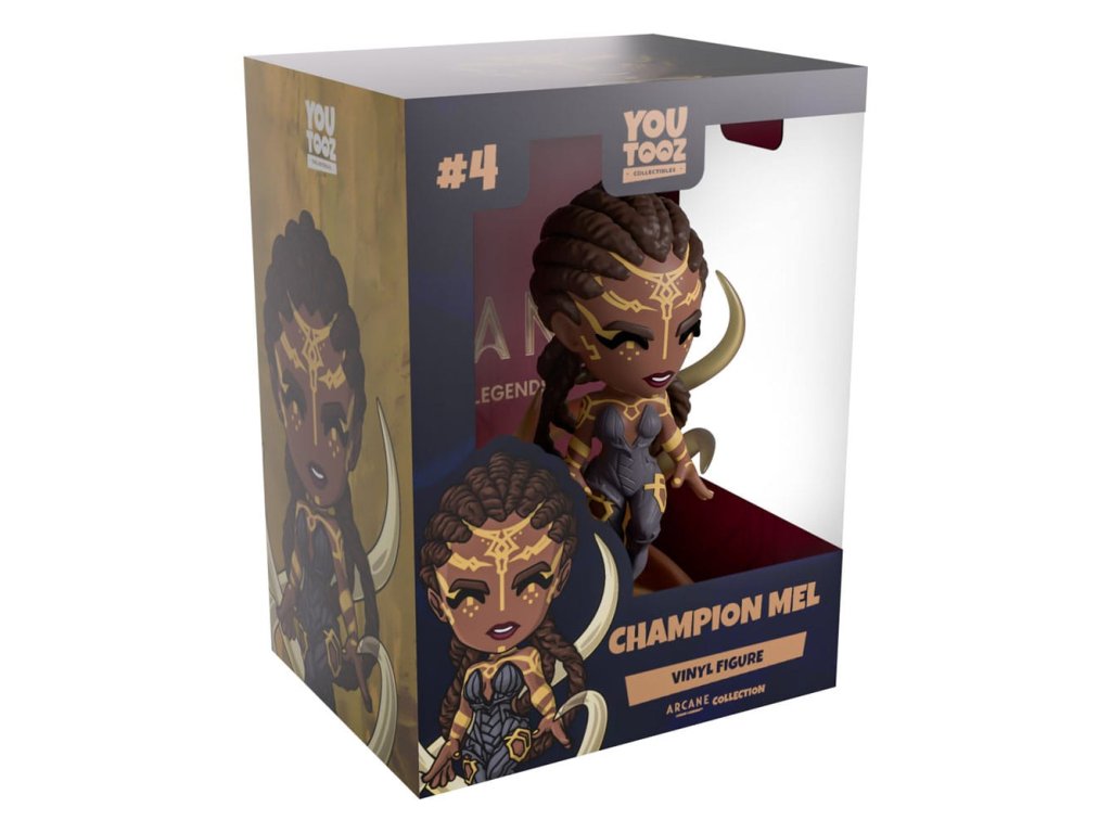 "Válka je selhání státní politiky." Ve světě Youtooz se v poslední době věci zahřívají a my jsme požádali o pomoc tu nejlepší politickou mysl, kterou jsme mohli vymyslet! Figurka Mel je vysoká 4,7 palce a levituje mezi vířícími průzračnými prameny, když uvolňuje svou sílu. Složité zlaté vzory označují její tmavou pokožku a běží od jejího čela dolů po její ruce a záda. S tmavě upletenými vlasy pevně stáhnutými k hlavě a padajícími jí po zádech ve třech silných smyčkách, nosí tmavošedý oděv spletitě proužkovaný, který vede až k nohám. Vnější strana jejího obalu má lehce rozmazanou žlutou barvu s hlubokou vínovou stopou, která pokračuje do vnitřního obalu a obklopuje ji zcela. Ochranný obal je pak tmavě modrý s jednoduchým zlatým rámečkem a její figurka je vidět skrz velké průhledné okno na přední straně balení. Tato sběratelská figurka je dodávána v matném, reliéfně lisovaném, ochranném vnějším obalu a v plastovém chrániči na míru pro maximální ochranu během přepravy.O Arcane:Arcane je animovaný seriál vytvořený Christinou Linke a Alexem Leem, produkovaný animačním studiem Fortiche a distribuovaný prostřednictvím Netflixu. Seriál se odehrává v univerzu League of Legends od Riot a hlavně sleduje sestry Jinx a Vi, spolu s dalšími známými tvářemi, aby ukázal svět a události, které je formují do lidí, jakými jsou dnes.