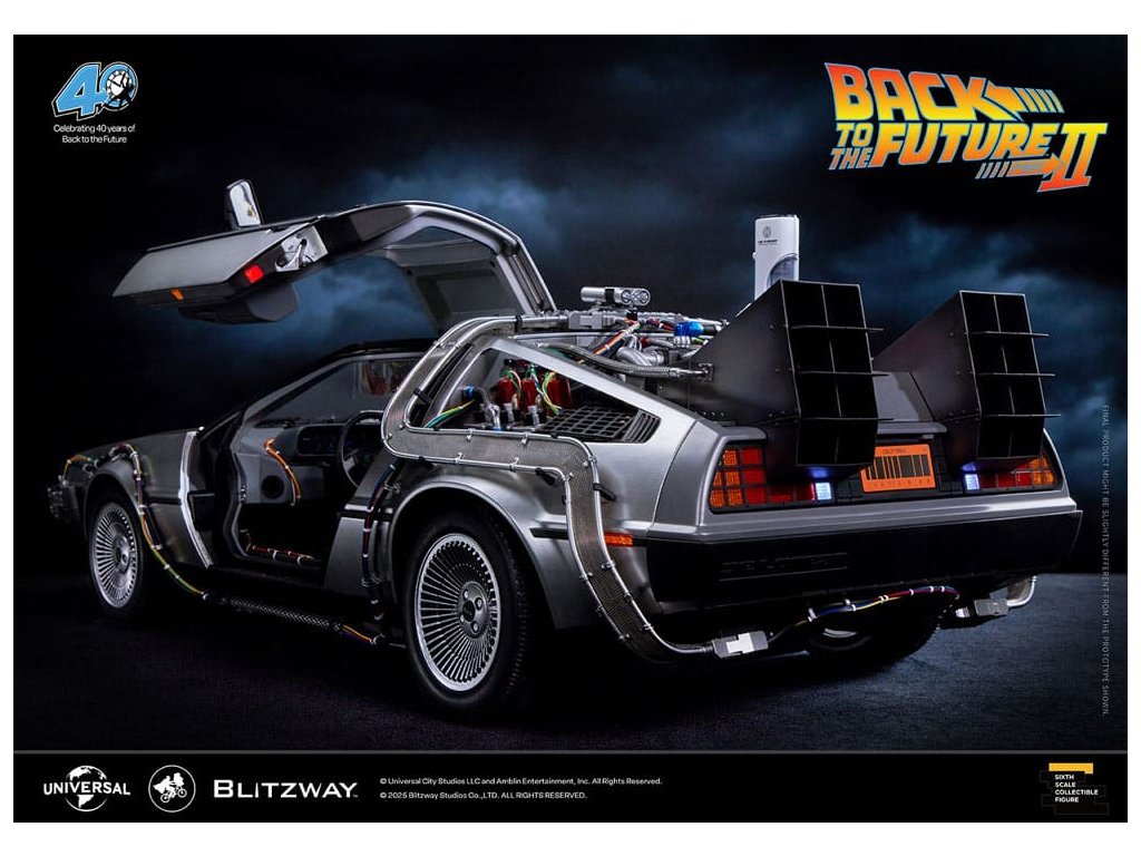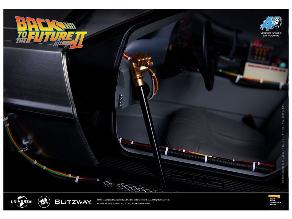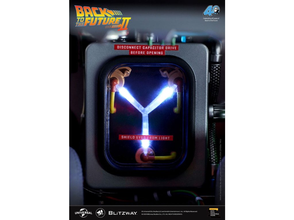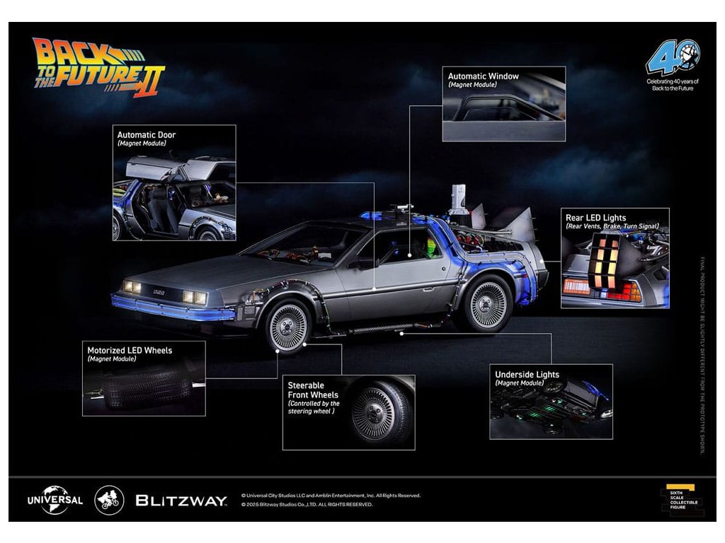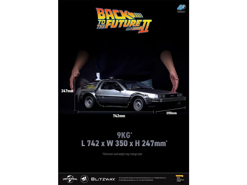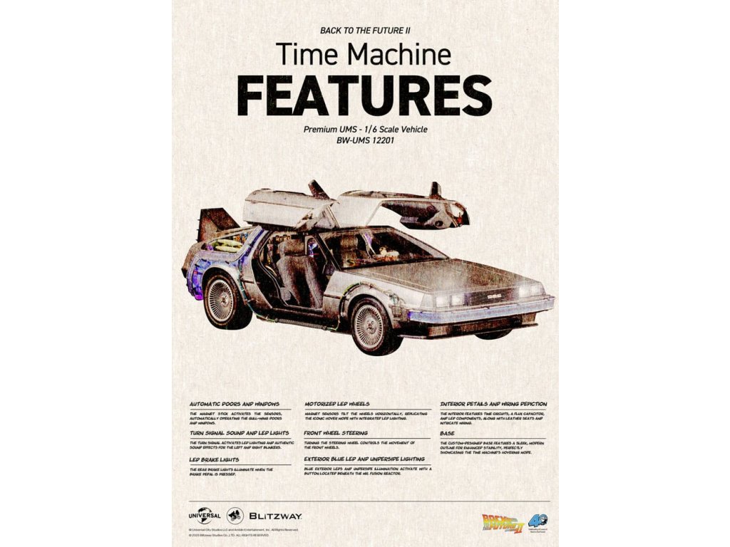 Klasický sci-fi film z roku 1985 „Návrat do budoucnosti“ mistrovsky kombinuje okouzlující příběh o cestování časem s pečlivě vytvořenými detaily, což vede k filmovému mistrovskému dílu, které je dodnes oslavováno. Mimo své příběhové geniality si film vydobyl své místo v historii tím, že inspiroval trvalou lásku k ikonickým produktům, které se v něm objevují, jako je například Nike a Pepsi. „Návrat byl pouze začátek“ - Návrat do budoucnosti II. První automobilový projekt BLITZWAY z roku 2025 představuje ikonický „časový stroj“ z Návratu do budoucnosti II, který oslavuje 40. výročí tohoto legendárního filmu. Tato novinka představuje detaily „Časového stroje“ v poměru 1/6, zachycuje každý prvek přesně tak, jak byl vidět na obrazovce. Prezentuje bezkonkurenční technologickou odbornost a přesné umělecké schopnosti BLITZWAY, které jsou ještě více vylepšeny integrovanými zvukovými funkcemi. BLITZWAY s 8 klíčovými funkcemi pozvá fanoušky, aby se znovu ponořili do vzrušení z Návratu do budoucnosti II, zachytává nostalgii a zázrak časového stroje, jako by procestoval 40 let, aby se před vámi objevil dnes. 1. Automatické dveře a okna Pomocí přiloženého magnetu aktivujte magnetické senzory ve dveřní rukojeti, které umožňují automatické otevření a zavření ikonických křídlových dveří stroje. Navíc vestavěné magnetické senzory v oknech umožňují hladký a realistický pohyb nahoru a dolů. 2. Zvuk startu motoru, zvuk blinkru a LED světla Jako skutečné vozidlo vydává motor zvuk startu a blinkry lze aktivovat pomocí indikátoru vedle volantu. Tato funkce nezahrnuje pouze LED osvětlení, ale také zahrnuje autentické zvukové efekty. 3. LED brzdová světla Když se stlačí brzdový pedál, zadní brzdová světla se rozsvítí, stejně jako u skutečného vozidla. 4. Motorizovaná LED kola S využitím magnetických senzorů zabudovaných do základny se všechna čtyři kola automaticky nakloní vodorovně, čímž se replikuje ikonický vznášedlý režim časového stroje. Efekt je dále zvýrazněn LED osvětlením. 5. Řízení předního kola Otočení volantu řídí pohyb předních kol doleva a doprava. 6. Modré vnější LED a spodní osvětlení Pomocí tlačítka umístěného pod reaktorem Mr. Fusion můžete aktivovat modrá LED světla na exteriéru, což replikuje ikonické světelné efekty filmu. Navíc, když je umístěn na základnu, spodní LED osvětlení dodává hloubku a realismus, odhaluje detaily skryté uvnitř produktu. 7. Detaily interiéru a zobrazení kabeláže Interiér časového stroje je vytvořen tak, aby odpovídal on-screen verzi, představuje zobrazení časových obvodů, Flux Capacitor a další komponenty vybavené LED. Každý detail, včetně řadicí páky, skutečných kožených sedadel a složité kabeláže, jak uvnitř, tak vně vozidla. 8. Základna Zakázkově navržená základna představuje elegantní, moderní obrys, který nabízí lepší stabilitu a rozměrnost, aby dokonale prezentoval levitující efekt časového stroje. Kromě těchto 8 klíčových funkcí objevte řemeslné dovednosti a špičkovou technologii, které oživili umělci BLITZWAY. Připravte se na zážitek z nezmaru BLITZWAY's Návrat do budoucnosti II 'Časový stroj'! Rozměry: 35 x 74 x 36 cm