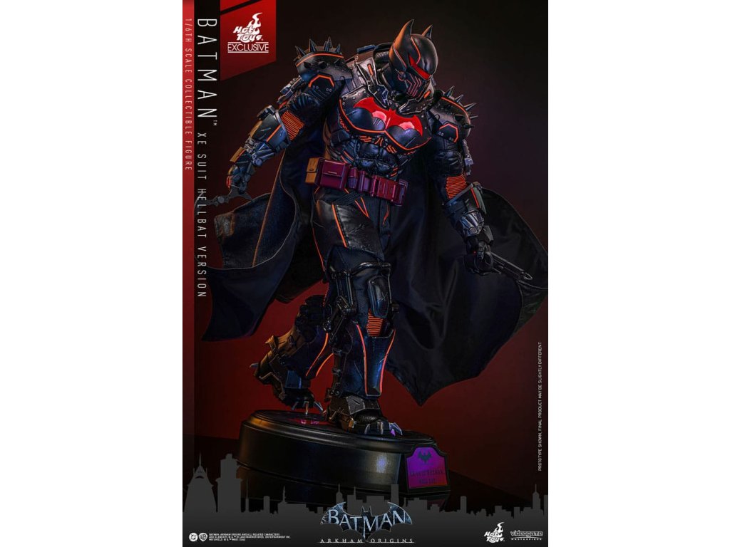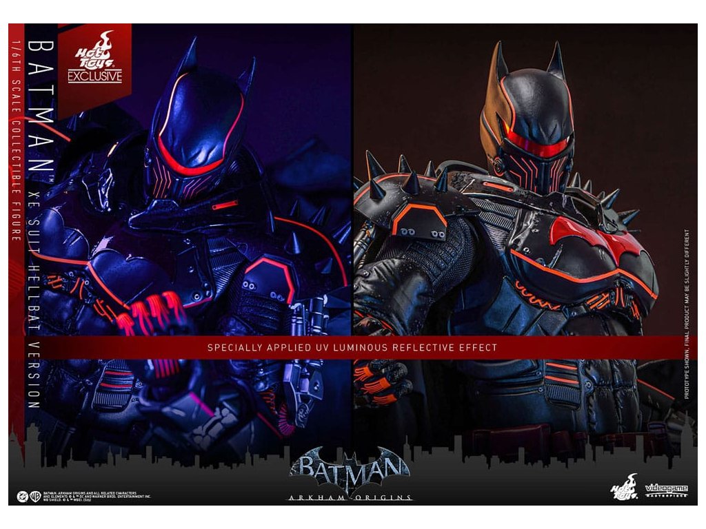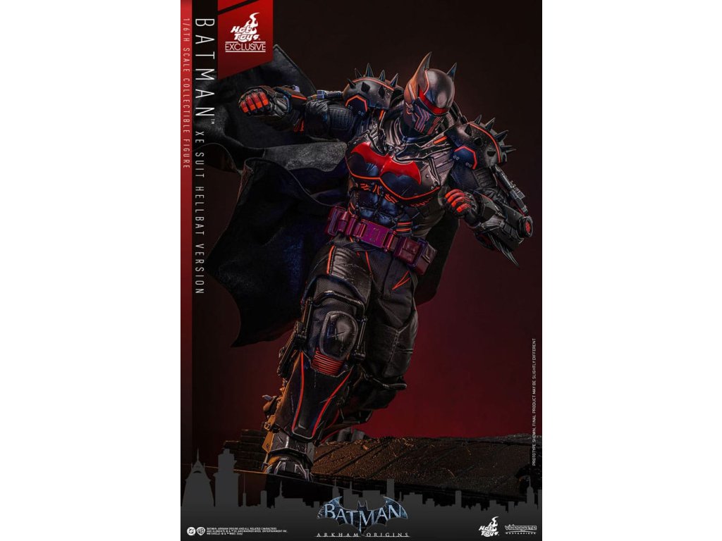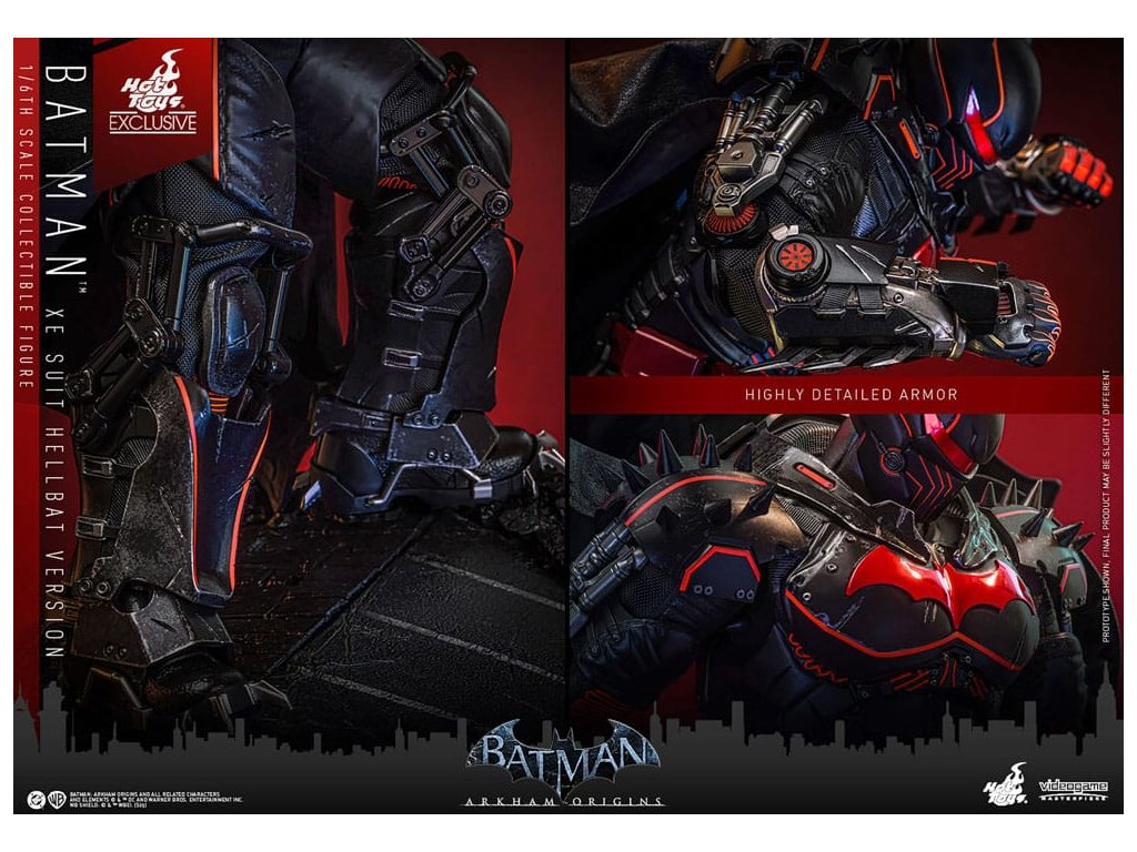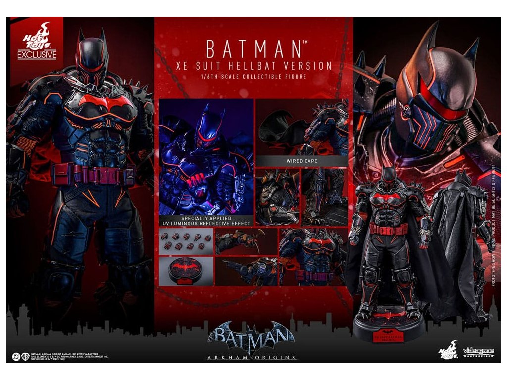 Ve příběhovém DLC 'Cold, Cold Heart' hry Batman: Arkham Origins obléká Batman Xtreme Environment (XE) Suit - teploměrem pancíř určený k čelbě proti ledové kryotechnologii Mr. Freeze. V DC Comics je Hellbat armor nebezpečný oblek vytvořen Batmanem s pomocí Justice League k čelění hrozbám, které překračují lidské limity. Tento oblek poskytuje mimořádnou sílu, let, projekci energie a schopnosti pláštění, které stojí Bruce drahé, protože jeho moc živí jeho vlastní životní sílu. Na oslavu dne Batmana představují Sideshow a Hot Toys sběratelskou figurku Batman (XE Suit Hellbat Version), odvážnou fúzi, která kombinuje ledovou rezistenci XE Suitu s devastující silou Hellbatu. Tato exkluzivní figurka je dostupná v omezeném nákladu 2000 kusů, výhradně na vybraných trzích. Figurka DC Comics je vybavena nově vyvinutou helmovou hlavou inspirovanou tvorbou Hellbatu. Stojí přibližně 33 cm vysoký, robustní obrázek má devět vyměnitelných rukou, včetně pěstí, rukou držících Batarang, otevřených gestikulačních rukou a ruku naslouchající telekomunikačnímu signálu pro pohlcující prvek pose. Kostým je těžce obrněná verze XE Suit s estetikou Hellbatu, včetně elektrolyzovaného červeného bat-symbolu, červeně vyvedených detailů se speciálně aplikovaným UV luminiscentním reflektivním efektem, plus odraném vzhledu. Oblek je doplněný ohebným drátem zapuštěným do černého pláště a výrazným červeným pomocným opaskem. Zbraně zahrnují Batmanův hák a dva Batarangy, vše prezentované na speciálně navrženém stojanu na figuru. Tato figura zachycuje vzácný okamžik, kdy se přežití setkává s téměř božskou silou, a skutečně ztělesňuje Batmana, který své lidstvo tlačí na hranice v hledání spravedlnosti, což je nezbytností pro sběratele Batmana! Limitovaná edice 2000 kusů.Doplňkové parametry