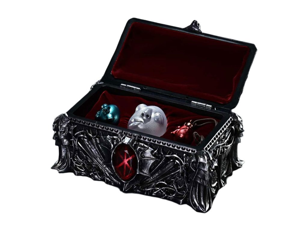 Emblém Zákona o příčinnosti, který odpovídá tužbě svého nositele. Uzavřený v lebce ve velikosti života. Zákon příčinnosti - síla, která vládne těm, kteří jdou smrtelným světem a dokonce i těm, kteří bydlí v astrální říši. Berelit, symbol tohoto jádra tématu 'Berserk', se nyní připojuje k sérii Životních velikostí Masterline. Tajemné objekty, které si vybraly mečováni svého osudu, Sokol hledající dominium a Hrozný císař na východě, byly každé realizovány jako sběratelé v životní velikosti. Guts' Behelit má jemný modrozelený odstín dosažený vrstvenou barevností. Griffithův Behelit je zavázán provazem, který odkazuje na jeho vzhled v originálním díle. A za dohledu Studia Gaga, Ganishkov Behelit, dostal svou první definovanou barevnost v mystickém stříbře. Každý kus věrně zahrnuje zkreslení, textury a další detaily znázorněné v mangě, výsledkem jsou formy, které se zdají být jemně opatřené životem. Krabička ve tvaru lebky, která drží tyto Behelity, je originálním designem Prime 1 Studia inspirovaným motivy úzce spjatými s Lebkovým rytířem, jako jsou lebky, meče a růžové révy. Vnitřek je potažen sametově podobnou látkou, zatímco LED osvětlená Značka oběti nabízí pohled do propasti. Jako speciální překvapení pro kupující, pět náhodně vybraných zákazníků obdrží Griffithův Behelit (Probuzená verze). Pláčící vejce krále se jistě dostane do rukou těm, kterým je určeno. Tribut v životní velikosti Zákonu příčinnosti - vyrobený s přesností, aby uspokojil nejhlubší touhy vaší sbírky. * Tento výrobek je určen k prohlížení / obdivování a vystavování. Jakékoliv propagační obrázky, které ho ukazují nošeného kolem krku, jsou pouze pro prezentaci. Prosíme, abyste se vyhnuli jeho použití jako doplňku. Vlastnosti: - Speciální krabice s LED osvětlením - Gutsův Behelit - Griffithův Behelit - Ganishův Behelit - Metoda napájení LED: Čeká se rozhodnutí * Připravte si baterie, USB kabely nebo jiné nezbytné předměty v závislosti na konečné metodě napájení. Rozměry produktu: 15 x 30 x 18 cm (Speciální krabice)5 x 4 x 5 cm (Gutsův Behelit)6 x 4 x 5 cm (Griffithův Behelit)8 x 7 x 8 cm (Ganishův Behelit). Orientační datum vydání: srpen 2027