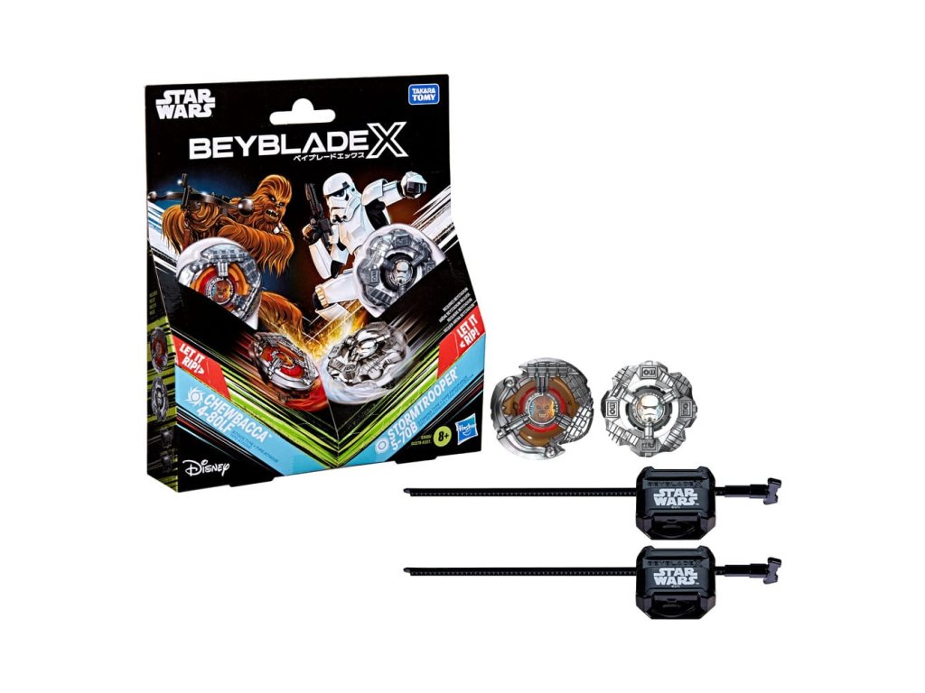 Zažijte Beyblade X, další generaci stadionů, odpalovačů a vrcholů Beyblade! Sada Beyblade X a Star Wars Collab Chewbacca 4-80LF proti Stormtrooper 5-70B Multipack obsahuje 2 vrcholy se správným otáčením a 2 spouštěče (vyžaduje se Beystadium, prodává se samostatně). Vyhodíte se přímo do bitvy nebo přeorganizujete vyměnitelné čepele, trysky a kusy vrcholů v tomto Star Wars Collab Multipacku s těmi z ostatních vrcholů Beyblade X (prodávají se samostatně) pro sestavení vašeho ideálního vrcholu Beyblade. Beyblade X má systém X-Celerator Gear, který vám pomůže zdokonalit svou hru. Když se ozubení vrcholu Beyblade X zapojí do kolejí arény Beystadium, může se ultra-zrychlit do extrémního sprintu, který ho vypálí kolem stadionu. Bladers odpalují své vrcholy do divokých srážek proti svým oponentům a získávají body - první, kdo získá 4 body, vyhraje. Hračky Hasbro Beyblade s autentickými odlévanými kovy Takara Tomy na vrcholu jsou skvělými dárky pro chlapce a dívky od 8 let výše.