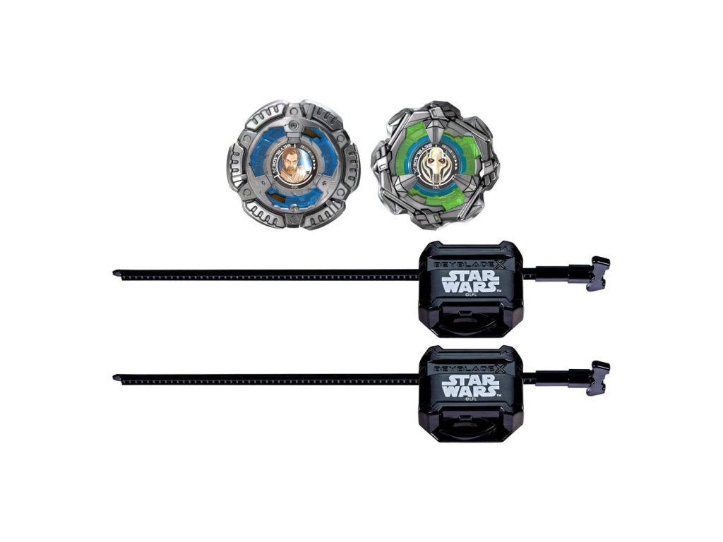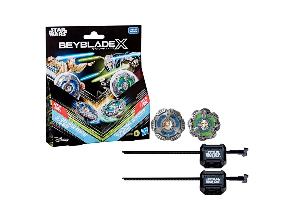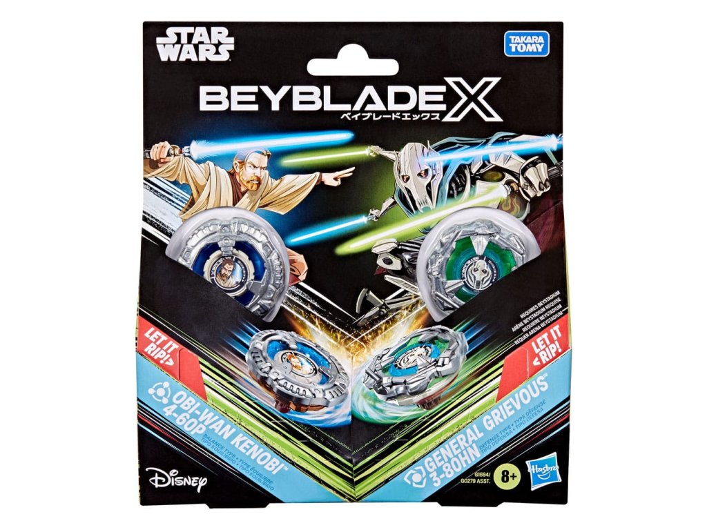 Užijte si Beyblade X, další generaci stadionů, vypouštěčů a vrcholů Beyblade! Sada Beyblade X a Star Wars Spolupráce Obi-Wan Kenobi 4-60P proti Generalovi Grievous 3-80HN Multipack obsahuje 2 vrcholky točící se doprava a 2 vypouštěče (Beystadium nutné, prodává se zvlášť). Vstupte přímo do bitvy nebo přeconfigurujte vyměnitelné čepele, trnky a bit vrcholků v tomto Star Wars Spolupráci Multipacku s těmi od jiných vrcholů Beyblade X (prodávají se zvlášť) a sestrojte svůj perfektní vrchol Beyblade. Beyblade X má Systém Vybavení X-Celerátor pro vylepšení hry. Když se vybavení vrcholu Beyblade X zapojí do kolejí arény Beystadium, může se super-zrychlit do Xtreme Dash a raketově se roztočit po stadionu. Hráči vypouštějí své vrcholky do prudkých střetů proti svým protivníkům a sbírají body - první, kdo dosáhne 4 body, vyhrává. Hračky Hasbro Beyblade s autentickými vrcholky z kovu od Takara Tomy jsou skvělými dárky pro děti ve věku 8 let a více.