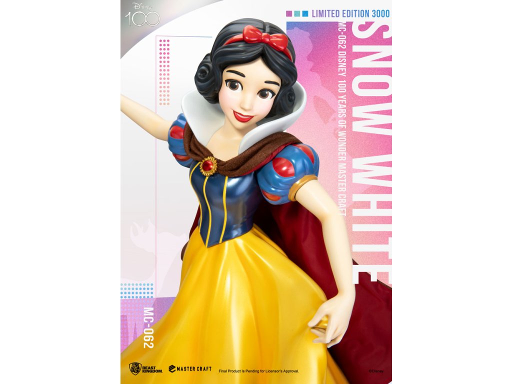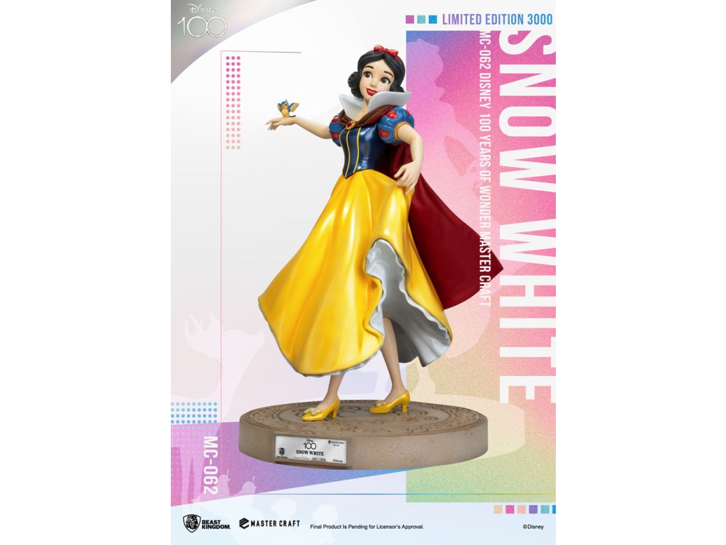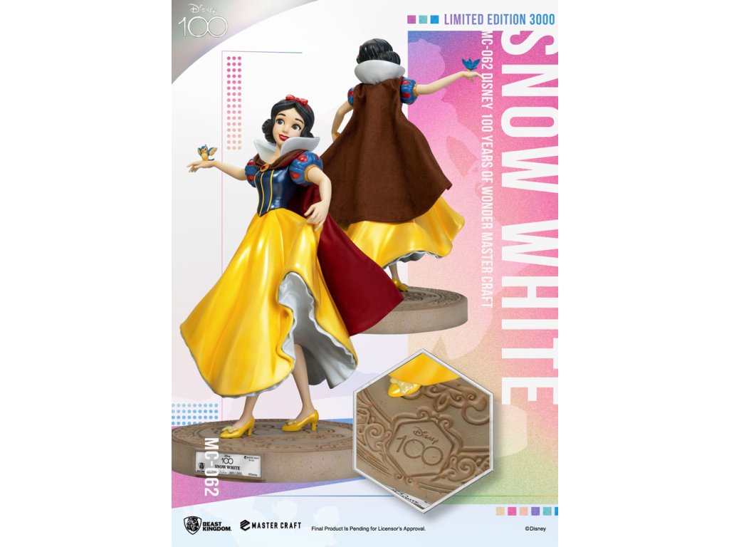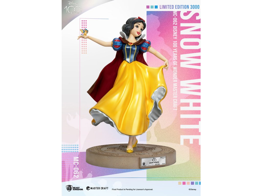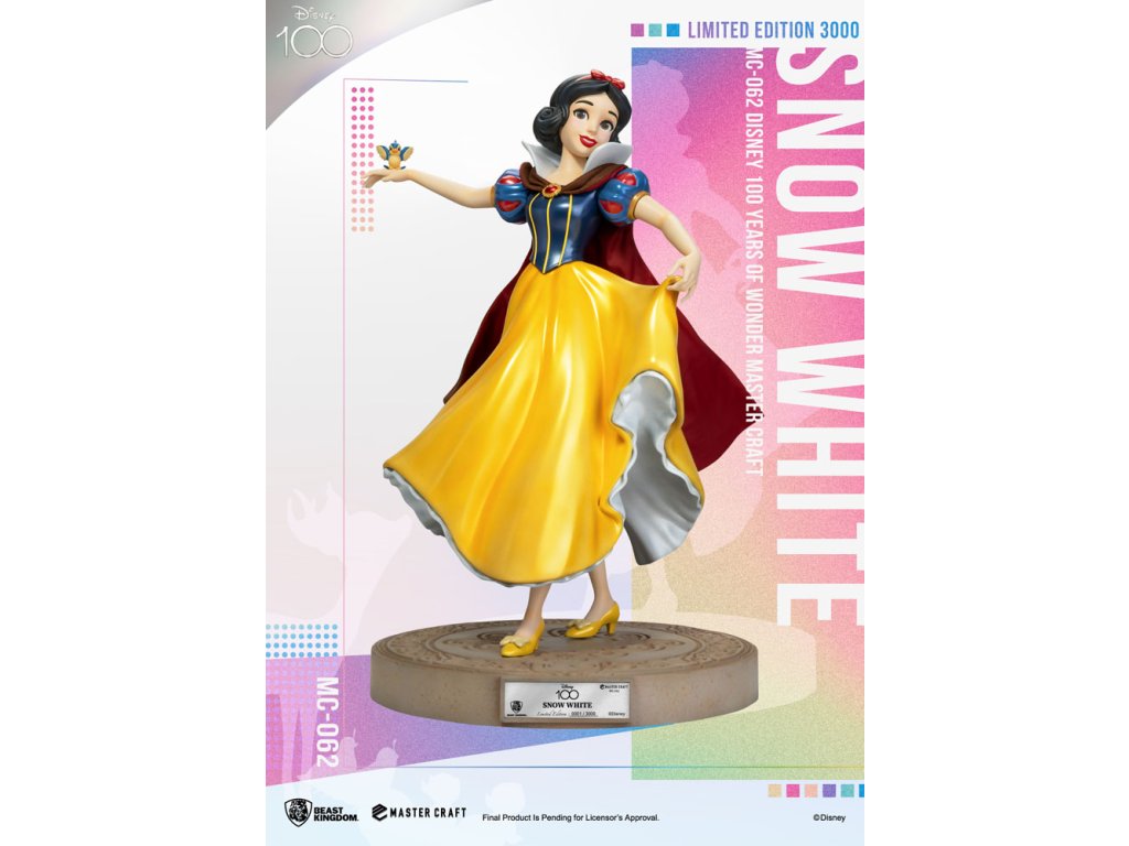 Disney 100 Years of Wonder je oslavou pro všechny generace. Tolik slavných postaviček se v průběhu let objevilo na našich obrazovkách a přineslo radost dospělým i dětem. Jednou z nich je postava ze starších let Disneyho a první celovečerní animovaný film je samozřejmě Sněhurka. Laskavá princezna, kterou otráví zlá královna a upadne do hlubokého spánku, který může probudit jen polibek prince! Řada MasterCraft velmi sběratelských soch od Beast Kingdom pokračuje v oslavách Disney 100 Years of Wonder s vydáním omezené edice sochy MC-062 Sněhurka MasterCraft. Obléká si svůj klasický modrý a zlatý šat princezny a poslouchá svého oblíbeného pěvce, Sněhurka je tělem elegance. Ručně malovaná socha oživuje všechny prvky této veselé postavy, včetně fantastické základny, na které je jablko a sova symbolizující moudrost. Omezeno na pouhých 3 000 kusů po celém světě, tuto klasickou postavu by měli sbírat a užívat si všichni fanoušci! Limitováno na 3000 sad na celém světě.Doplňkové parametry