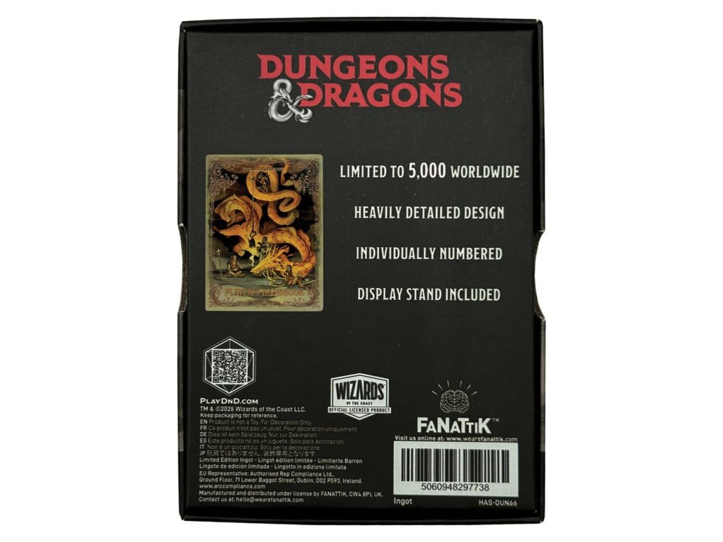 Ponořte se do ducha dobrodružství s touto oficiálně licencovanou Slitkovou Příručkou Hráče s Alternativním Obalem, inspirovanou výrazným alternativním uměním zobrazujícím majestátního zlatého draka. Každá šupina, oblouk a ornament z původního designu je věrně zrekonstruován na tomto jedinečném kovovém sběratelském kusu. Limitován na pouhých 5 000 kusů na celém světě, každý slitkový kus je individuálně číslován podél dolní hrany a je umístěn v speciálně navržené sběratelské krabici doplněnou vlastním stojánkem pro prezentaci. Dokončeno v antickém zlatém pokovení a hluboce raženo, nabízí věrný, hmatový poctu jednomu z nejikoničtějších pravidelných knih Dungeons & Dragons. - Oficiálně licencováno - Omezeno na 5,000 - Individuálně číslováno na dolní hraně - Antické zlaté pokovení - Velikost 88 x 65,5 mm