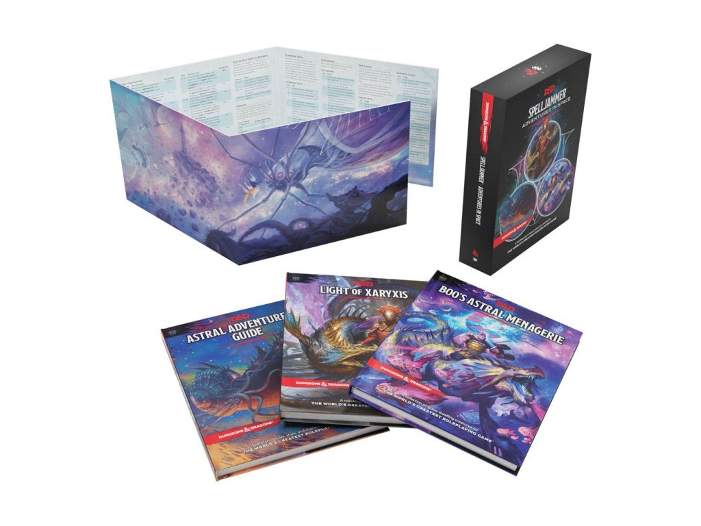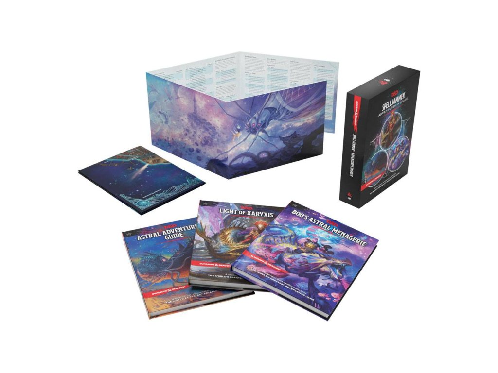 Domov hvězd a brána k nebi, Astrální rovina je plná vzrušení a možností. S pomocí magie mohou Spelljameři překonat oceány Wildspace, projít stříbrným prázdnotou zvanou Astrální moře a přesouvat se mezi světy D&D multiversa.Tato sbírka obsahuje vše, co Potřebuje Mistr sklepa k vedení kampaně v hvězdných říších Wildspace a Astrálního moře, stejně jako nové možnosti pro hráče, kteří chtějí vytvořit postavy doma v této fantastické scenerii. Obsah: - Sbírka zahrnuje dobrodružnou knihu, knihu o prostředí, knihu o monstrech, mapu na plakátě a obrazovku DM - Světlo Xaryxisu - 64-stránková tvrdá dobrodružná kniha v Astrální rovině pro postavy 5.-8. úrovně - Průvodce Astrálního Dobrodruha - 64stránková tvrdá kniha představující Astrální rovinu jako kampaňovou scénu, včetně vesmírných možností postav, kouzel, magických předmětů, vesmírných pravidel, lodí a dalšího - Astrální Mužíž Boo - 64stránková tvrdá kniha s herními statistikami a popisy více než 60 bytostí nacházejících se v Wildspace a Astrálním moři - Oboustranná plakátová mapa Skály Bral - asteroidové město, které může sloužit jak jako místo dobrodružství, tak jako centrum kampaně - Obrazovka DM - čtyřpanelová obrazovka Mistra sklepa navržená pro vesmírná dobrodružství.Doplňkové parametry