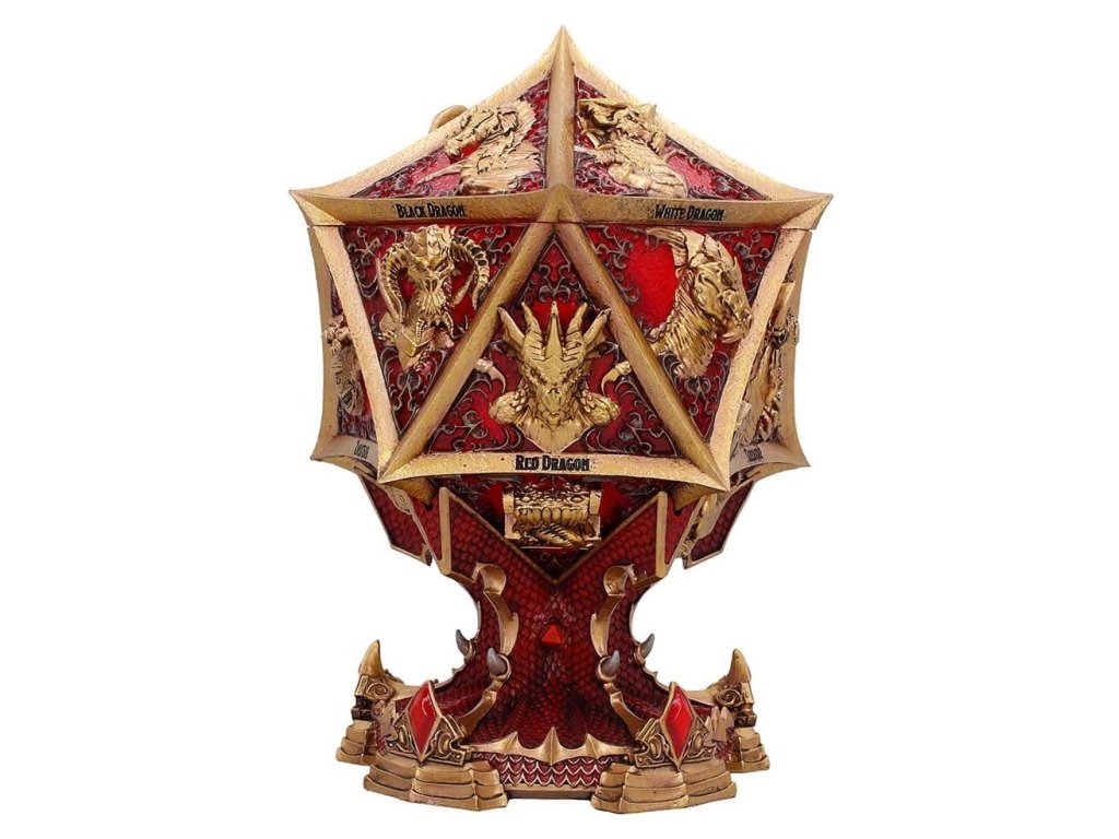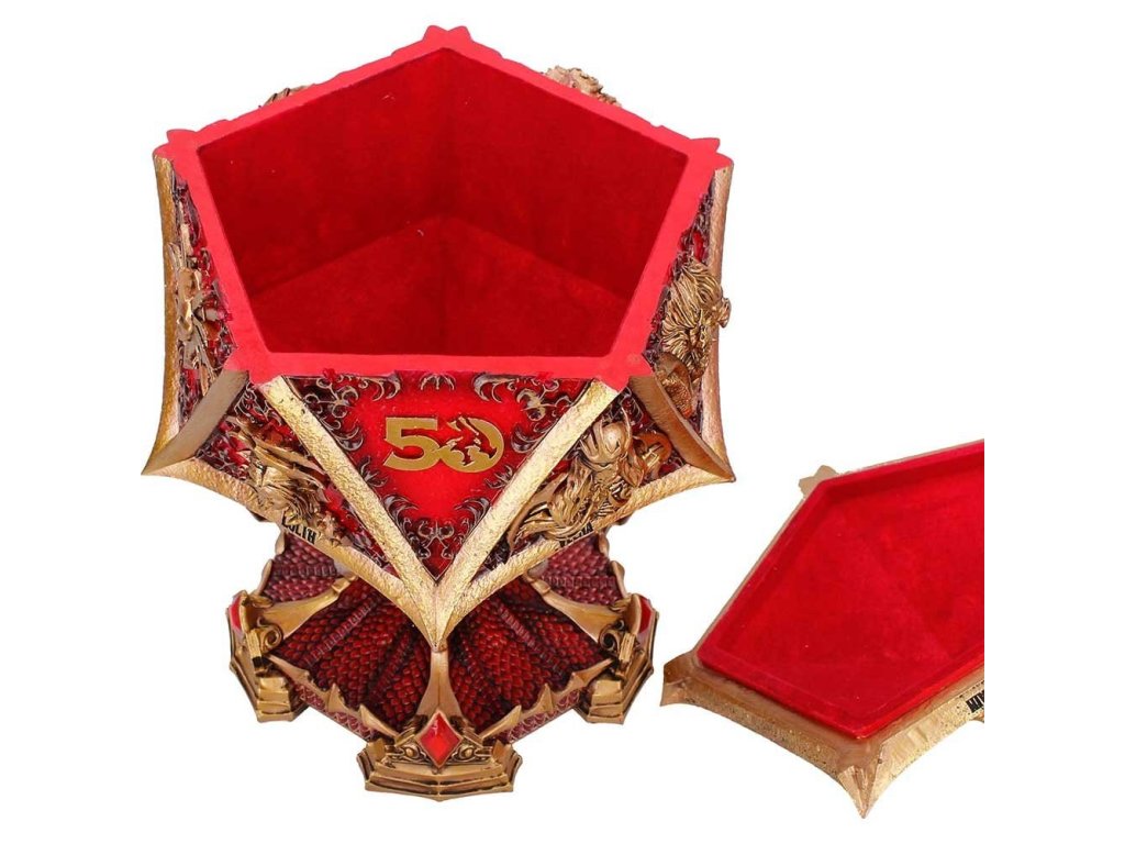 Exkluzivní sběratelská schránka, vyrobená k oslavě 50. výročí Dungeons & Dragons, ve tvaru dvacetistěnné kostky. Schránka je zdobena detailním 3D zlatým uměleckým zpracováním ikonických zloduchů a nestvůr z D&D, jako je Vecna, Beholder a mnoho dalších. Součástí je i odnímatelný víko, které odhaluje červené sametové vnitřní části. Baleno v oficiálně licencované zobrazovací krabici D&D, která zajišťuje bezpečný transport a zvyšuje sběratelskou hodnotu, ideální pro výstavu v obchodech nebo jako dárek pro fanoušky. Ideální pro dlouhodobé hráče D&D, sběratele fantasy suvenýrů, fanoušky TTRPG a kupující dárků hledající výrazný kus k oslavě výročí franšízy. Oslavte pět desetiletí dobrodružství s touto ručně malovanou výroční schránkou, nezbytným sběratelským předmětem pro fanoušky D&D a nápaditým centrálním kusem pro jakoukoli fantasy výstavu.Doplňkové parametry