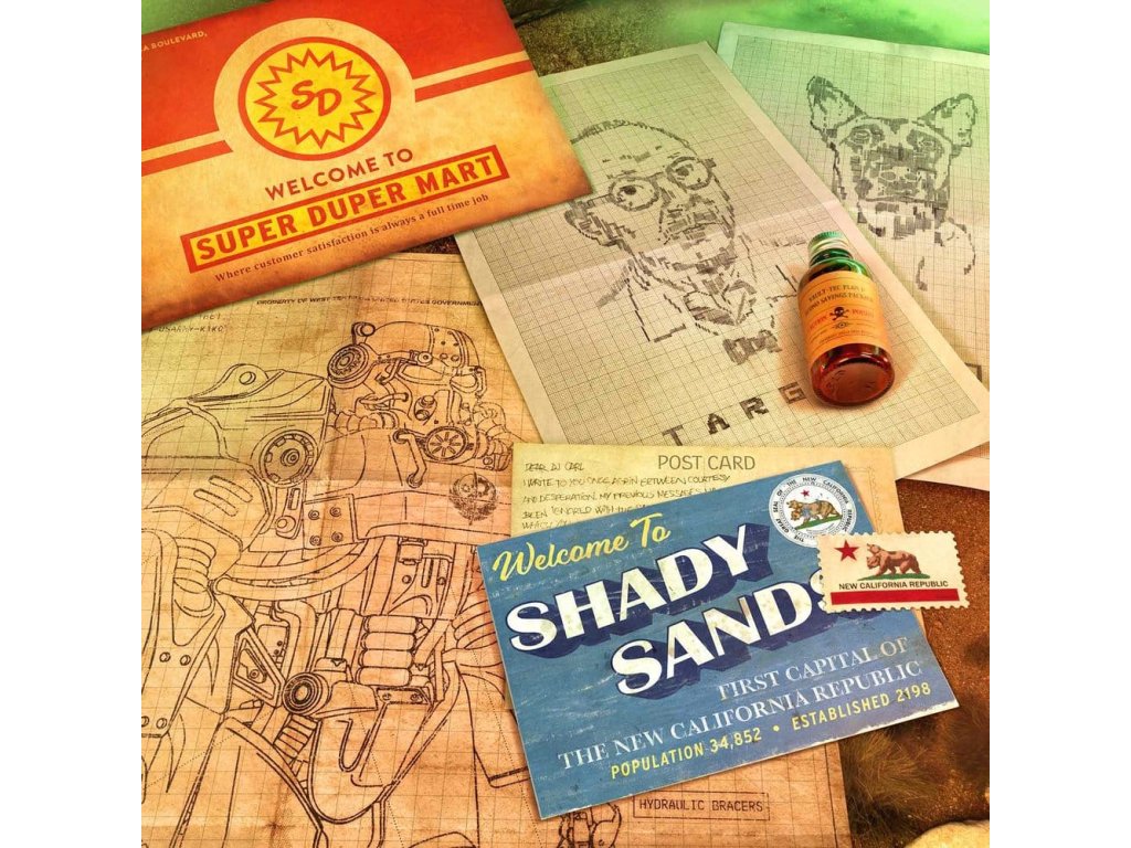 Jste připraveni objevit sady Poklady Wasteland? Je čas přejít Wasteland po boku Coopera Howarda, "Ghoula". Otevření sady Poklady Wasteland je jako prasknutí dávno zapomenutého trezoru uprostřed pouště a objevení největších pokladů z vesmíru Fallout, zachráněných před (a po) pádu bomb. Cesta minulostí i současností světa Fallout, přetvořená do jedinečného sběratelského předmětu, připravená ozdobit vaši vystavovací policu, vaši Vault, nebo ten malý kout Wastelandu, který nazýváte domovem. Tato sada obsahuje: - Odznak šerifa Coopera Howarda - Vlajka Bratrstva oceli (54 x 96 cm) - Láhev D Plan - Portrét cíle & společníka - Kovová cedule Pip-Boy - Plakát hledaného Coopera Howarda - Obálka tiskového kitu Coopera Howarda - Vizitka Hollywoodského hřbitova - Pin odznak "Feo, Fuerte y Formal" - Poštovní známka NCR - Modrá tisk (37 x 52 cm) - Výstřižek novin Capital Post - Pohlednica Shady Sands - Otvírák na lahve Red Rocket - Pohlednice Coopera Howarda - Obálka Super Duper Martu