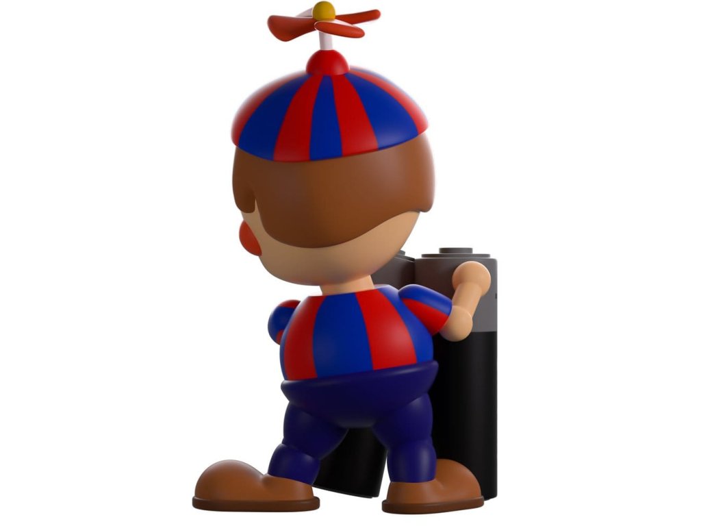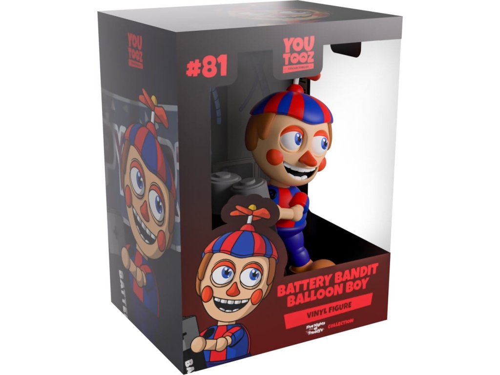"Ahoj!"Proč najednou zhasla světla? Rychle, vezmi si svítilnu... Počkat, kde jsou baterie?! To určitě byl on, Balloon Boy! Stojí 12 cm vysoko a drží v ruce pár vysokých baterií s červenými špičkami. S hlubokýma modrýma očima se usmívá, když na hlavě s hnědými vlasy odpočívá červeno-modrá vrtulníková čepice. Má dlouhý špičatý nos, velký úsměv a kulaté tváře. Na sobě má pruhovanou košili s knoflíkem na hrudi, tmavě modré kalhoty a tuhé hnědé boty. Na vnější straně obalu ho můžeme vidět, jak přes okraj stolu kouká na baterie, zatímco uvnitř obal pohlíží do tmavé místnosti s kostkovou podlahou, kde se na pozadí kupí staré monitory. Ochranný obal je poté pokrytý svislými modrými a černými pruhy s tlustými dráty visícími z vrchu, a jejich figurku lze vidět skrze velké, průhledné okno na přední straně obalu. Tento sběratelský předmět je zasílán v matném, reliéfním, ochranném vnějším obalu a v plastové ochraně přizpůsobené na velikost pro maximální ochranu během přepravy.O Five Nights At Freddy's:Five Nights at Freddy's je survival hororová hra vytvořená Scottem Cawthonem. Hra je nastavena tak, že hráč pracuje jako noční hlídač v rodinné pizzerii Freddy Fazbear, kde se rychle ocitá v konfliktu s několika rozumem obdařenými animatroniky. Krátce poté, co byla hra v roce 2014 vydána, získala kultovní následování a rychle se rozvinula v komplexní fiktivní vesmír plný příběhu a různých spin-offů. Orientační datum vydání: červen 2026