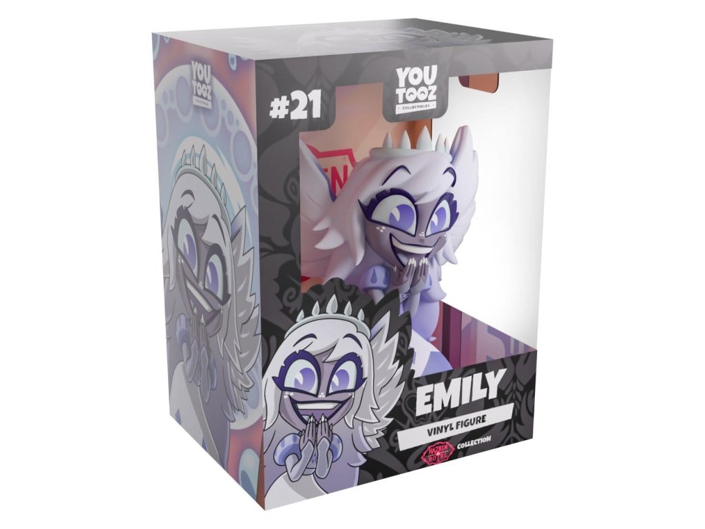 Vítejte v nebi! Emily se objevila na Youtooz, aby se stala tím nejzábavnějším, nejsmělejším a nejvíc cool kamarádem, kterého byste si mohli kdy přát! S výškou 12 centimetrů se její postava naklání dopředu, zatímco vykřikuje nadšení a zvedá ruce před nadšený otevřený ústa. Bílé pihamy jsou označeny na jejích tvářích a nosu pod pár obrovských fialových očí, zatímco - světle zelená svatozář je umístěna na její dlouhé vlasy, které mají na koncích fialovou barvu. S párem špičatých křídel vystupujících z jejích ramen, nosí fialové a bílé šaty s tmavými rukávy, které pokračují až na její ruce a zaoblená ramena. Na vnější straně jejího obalu je zobrazen zlatobílý pokoj s modrými osvícenými koulemi, zatímco v interiéru je pastelově oranžová a růžová obloha plná kulatých budov. Zachovávací obal je pak navržen tak, aby ukázal temnou městskou krajinu, zatímco její postava je vidět skrze velké, průhledné okno na přední straně obalu. Tento sběratelský předmět je dodáván v matném, raženém, ochranném vnějším obalu a v plastové ochraně přizpůsobené velikosti pro maximální ochranu během přepravy. O Hazbin Hotel:Hazbin Hotel je animovaný hudební seriál vytvořený Vivienne "VivziePop" Medrano, který sleduje princeznu pekla Charlie Morningstarovou, ve své snaze 'rehabilitovat' hříšníky, aby mohli vstoupit do nebe přes její 'Hazbin Hotel'. Po původním pilotním vydání na YouTube v roce 2019 byla první série premiérově uvedena na Amazon Prime Video v roce 2024, kde zaznamenala největší premiéru nové animované série na platformě.