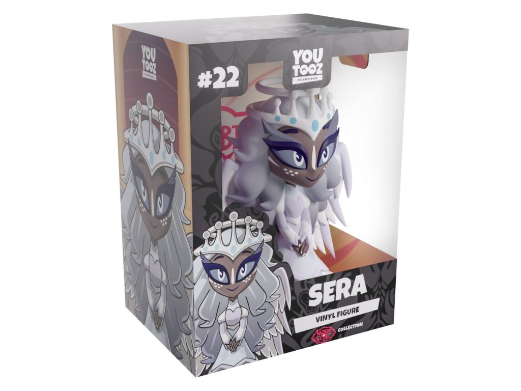 "Je to rozhodnuto." Sera viděla, že hříšníci skutečně mohou být spaseni a přišla k Youtooz, aby byla svědkem našeho vykoupení! Počkej...my nejsme hříšníci...nebo ano? Stojí vysoká 13 cm, ruce má zkřížené na prsou. Nad nimi jsou velké šedé a modré oči, stranou jí padají pihy na tvářích. Na stříbrobílých vlasech, které jí sahají až k pasu, spočívají dvě svatozáře. Na ramenou má rozložená elegantní růžová a bílá křídla. Je oblečená do andělských šatů s vysokým límcem a rukávy, které přicházejí přes její ruce, její kulatá bílá ramena odpovídají jejím předloktím, která jsou potažená vzorem v podobě diamantů, který běží po celé její dvouvrstvé siluetě. Vnější strana jejího obalu se dívá na složitý zlatý ciferník, zatímco interiér je plný vířících mraků proti oranžové a fialové obloze. Ochranný obal je poté navržen tak, aby zobrazil tmavou mnoheměstskou krajinu, zatímco její figurka je vidět skrz velké průhledné okno na přední straně obalu. Tento sběratelský předmět se dodává v matném, reliéfním, ochranném vnějším obalu a vlastnoručně vyrobeném plastovém obalu pro maximální ochranu během přepravy. O Hazbin Hotel: Hazbin Hotel je animovaný hudební seriál vytvořený Vivienne "VivziePop" Medrano, který sleduje princeznu pekla Charlie Morningstar v jejím cíli 'rehabilitovat' hříšníky, aby se mohli dostat do nebe prostřednictvím jejího 'Hazbin Hotelu'. Po pilotním vydání na YouTube v roce 2019 měla první sezóna premiéru na Amazon Prime Video v roce 2024 a stala se největší premiérou nového animovaného seriálu na této platformě.