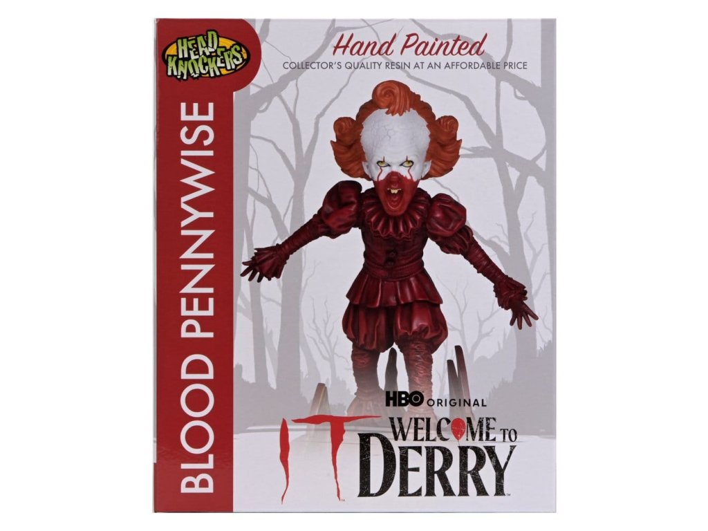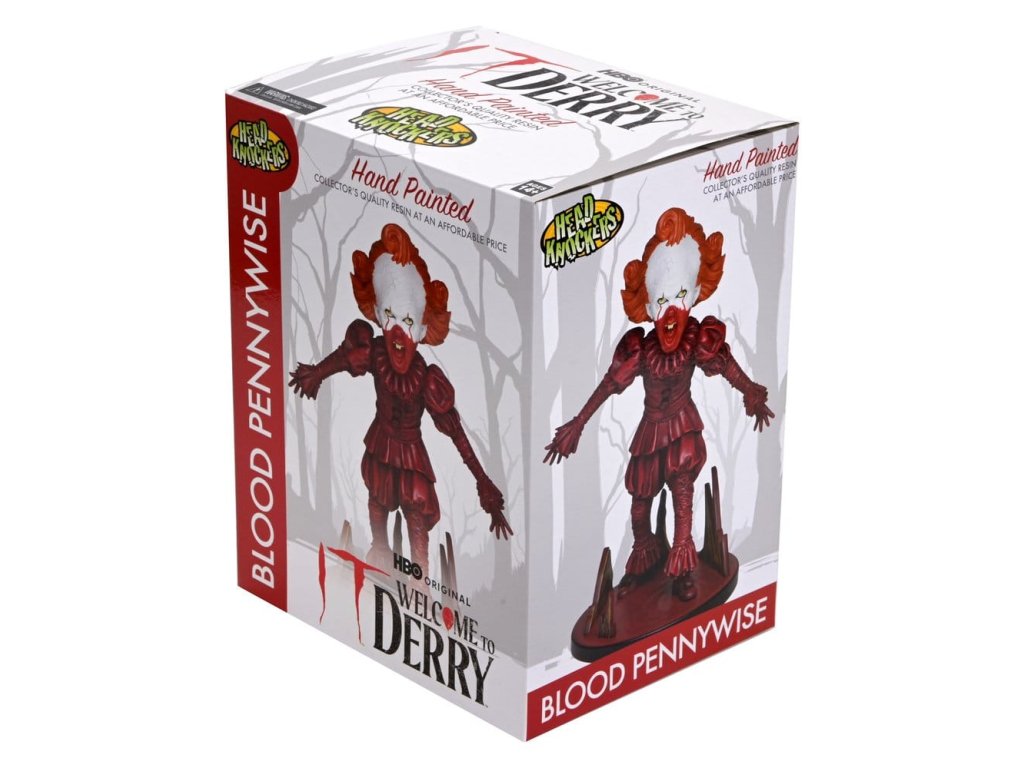 Něco zlého se skrývá v kanálech pod Derry a je připravené vstoupit do vašich nočních můr! Ze série IT: Vítejte v Derry pochází Bloody Pennywise Head Knocker, unikátní kousek pro jakýkoli sběratel hororových pamětihodností. Tento interaktivní hororový sběratelský kousek je inspirován jeho nezapomenutelným krvavým vzhledem ze série hitových prequelů a zobrazuje hrozivého Pennywise pokrytého krví a připraveného zaútočit! Pružinový mechanismus tuto děsivou postavu oživuje pohybem bobbující hlavy. Měří více než 7,5 palce na výšku a je dodáván v sběratelském matném balení se zářivým leskem.